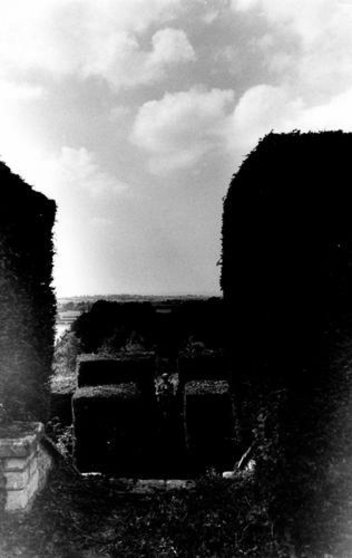 Flights of stone steps lead down to two further grassed terraces, divided by dense bow hedges and stone walls. Two finials from the tower or buttresses of St. Adelaide's church stand on pillars on either side of the first flight. There are other decorative pieces and a statue on the terraces, all of concrete and fairly modern.