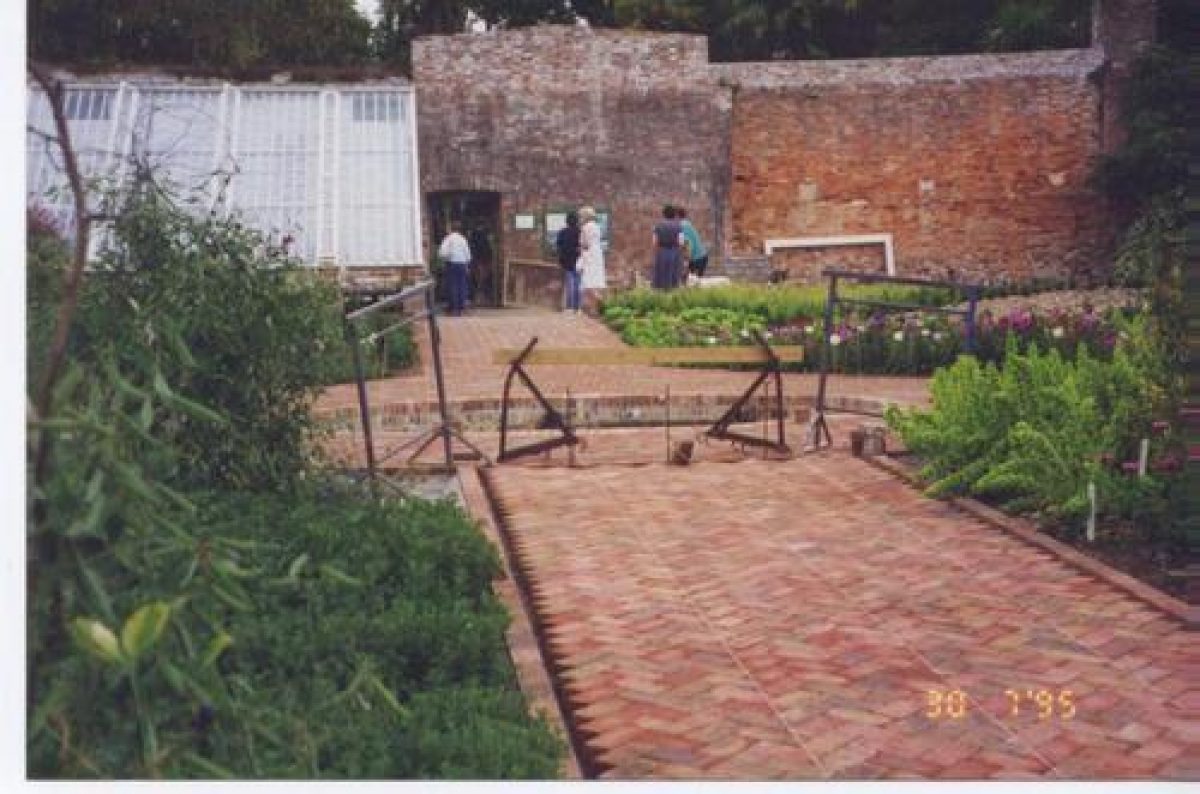 The kitchen garden comprises two walled gardens and a vegetable garden situated to the north of the house. The southern garden, known as the Flower Garden, is approximately trapezoid in shape and is enclosed by late C18 walls c 5m high constructed from imported brick (listed grade II) (guidebook). The garden is today (2000) used for growing a variety of vegetables and flowers, while fruit trees are trained against the walls. The garden is entered from the south through an entrance flanked by early C20 stone piers surmounted by ball finials. The south entrance leads to a central brick-paved walk which extends north to a central circular dipping pool, beyond which the walk continues to a door in the north wall. A transverse walk to the west divides the west half of the garden into two large beds, while the single area to the east is divided into geometrical-shaped planting areas by low box hedges. The late C20 path pattern replaces the Y-shaped pattern shown on the late C19 OS map (1881). Two glasshouses, a citrus house, and a vinery of 'Paxtonian' form stand against the inner face of the north wall, while a later peach house is built against the inner face of the east wall. A range of associated structures including a bothy and office, and a small square glasshouse for growing bananas stand against the outer face of the north wall.
