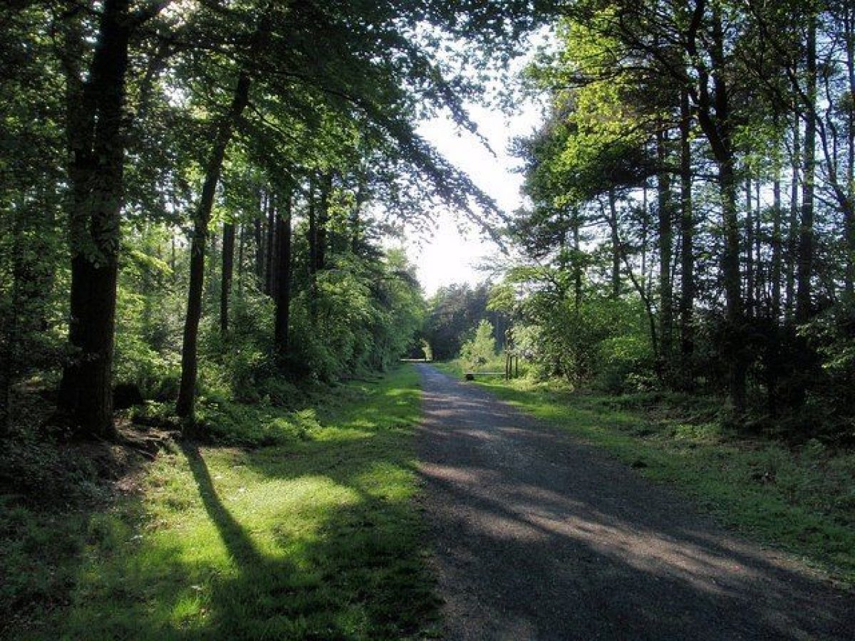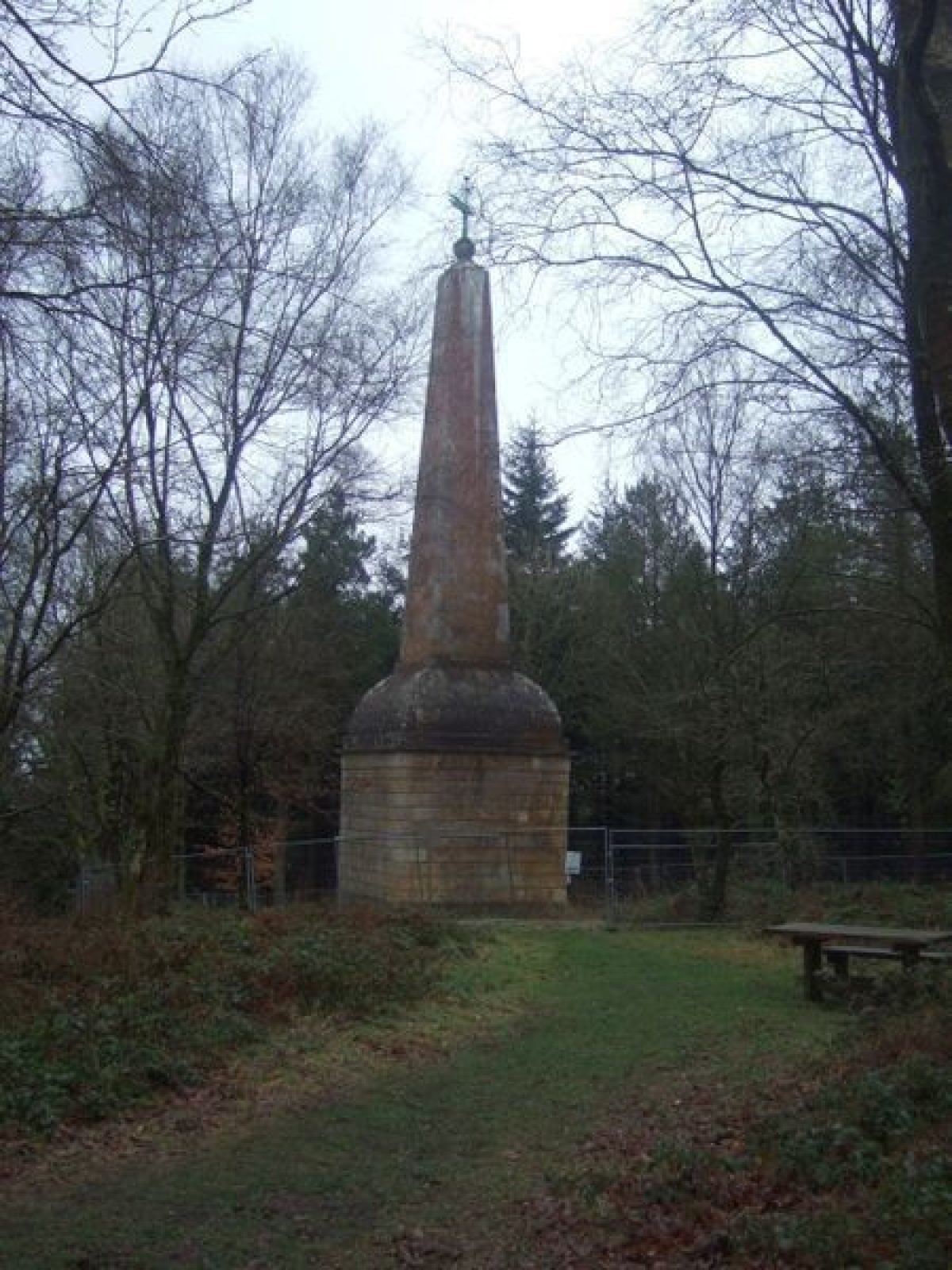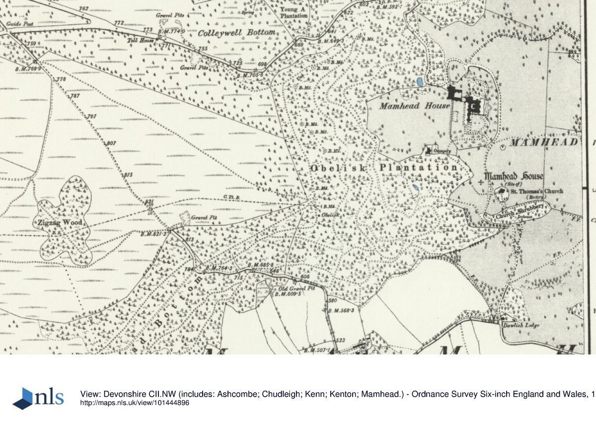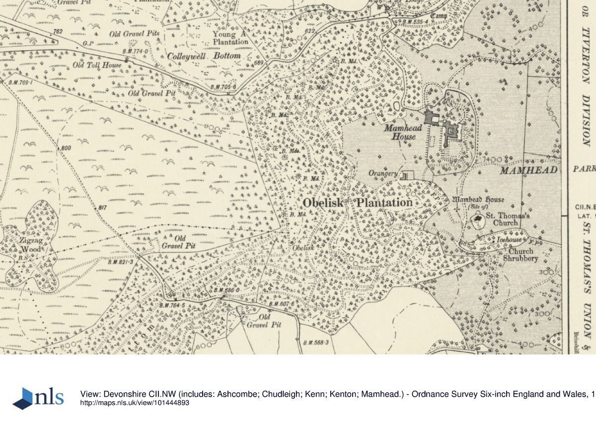 The woodland rises to the ridge, on which an obelisk (listed grade II*) stands some 590m south-west of the House, built as a daymark for shipping in the Exe estuary by Thomas Balle in 1742. The limestone obelisk rises from a convex-topped pedestal, and is surmounted by a ball finial and copper weathervane in the form of a flaming arrow. Carriage drives and walks shown on the Tithe map (1839) which survive as footpaths afford wide views north-east, east and south-east across the park and surrounding country to the sea and Exe estuary. In 1835 the expansion of the plantations and introduction of silver fir west of the House was noted (Gardener's Mag 1835). A further mixed plantation, Black Forest, adjoins the north-east drive c 1.25km north-east of the House, and was described by Loudon in 1842 (Gardener's Mag 1842).
