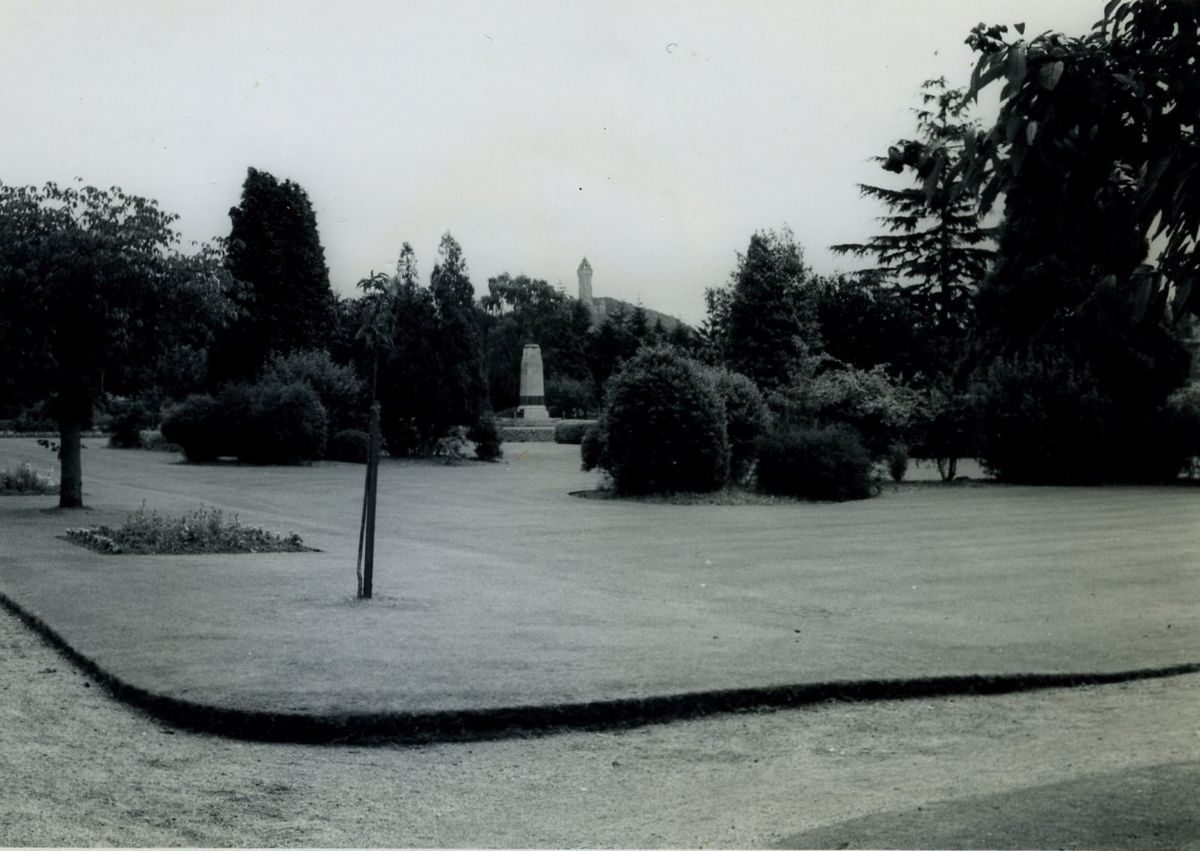 An historic photograph titled Memorial Park, Bridge of Allan reveals a later view of the park, around 1955, gauging the age of the cherry trees in the foreground. The photograph was taken from an elevated vantage point to the north-east of the park, probably out of a first floor window to Museum Hall. The photograph records Memorial Park some thirty years after it was laid out. Established cherry trees in blossom within tree avenue along Henderson Street boundary are in the foreground. The established kidney or lozenge shaped planting beds are in the middle ground, set within a highly manicured grass lawn. The semi-circular Yew hedges to either side of the memorial have matured. Spring bulbs (daffodils) can be seen in the foreground and to either side of the Keir Street entrance. The tree and shrub planting which forms the crescent shaped planting bed to Keir Street is indicated for the first time. Individual deciduous trees, including the oak which have yet to come into leaf can be identified, as can the form of the evergreen trees including the giant redwood. Circular beds are discernable to either side of the memorial along the axial path.