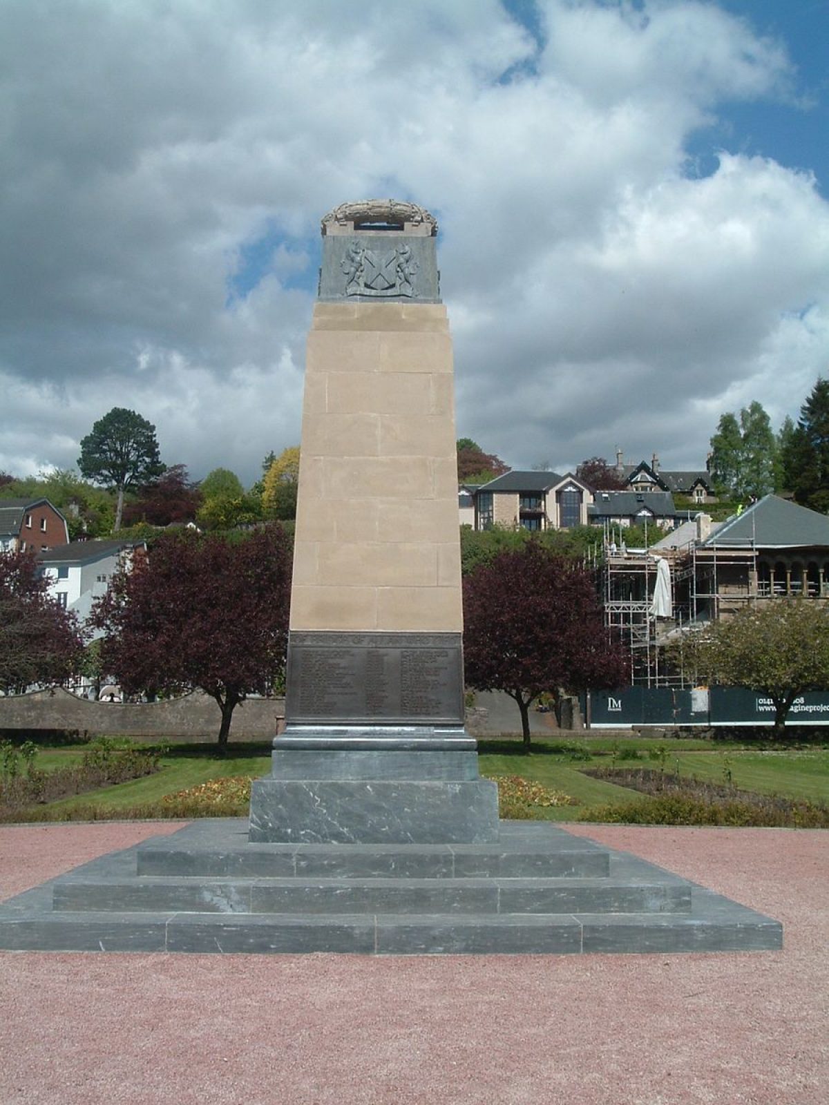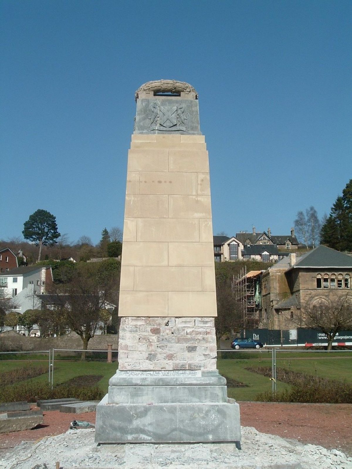 - Description: The War Memorial is an Obelisk, sculpted from Hepton Wood grit stone, set on a plinth consisting of three marble steps. The names of fallen soldiers are displayed on bronze plaques which are set around the base of the obelisk. These plaques originally recorded soldiers from World War 1. Names of soldiers who fell during World War 2 were added in 1947. A plaque reads ‘RAISED IN HUMBLE GRATITUDE TO THE MEMORY OF THE MEN OF BRIDGE OF ALLAN WHO DIED IN THE GREAT WAR’. A Laurel wreath carved in sandstone surmounts the obelisk. The south face displays a shield with a cross and star. The west face displays the badge of the Argyll and Sutherland Highlanders. The north face displays a shield of two unicorns and the cross of Saint Andrew. The east face displays the badge of the Black Watch.The steps to the memorial are made of Bardiglio Nuvolato, an Italian marble which display deep white veins within the grey stone. The War Memorial is included in the UK National Inventory of War Memorials www.ukniwm.org.uk as Ref. 5791.