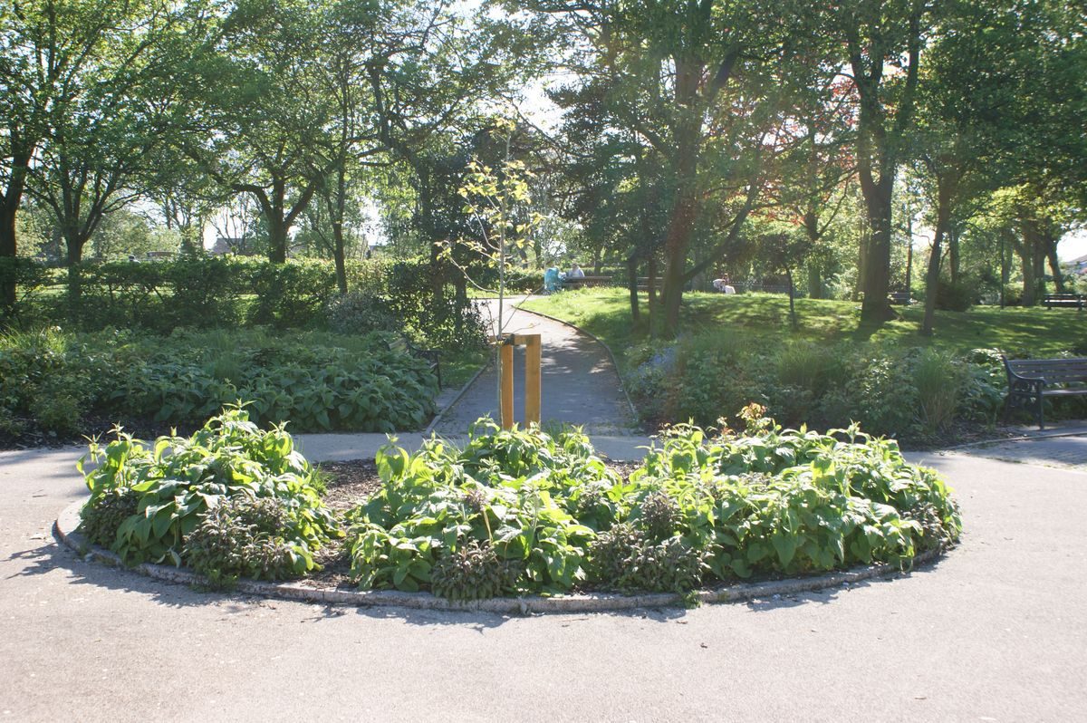 To the south-west of the war memorial there is a triangular sunken rose garden with a small centrally-placed circular lawn from which paths radiate in five directions. South of the rose garden modern seating and a modern children's play area have recently been installed. Immediately to the west is an avenue connecting the park's Wellbeck Avenue entrance with the south-west entrance. To the west of this there is an ornamental pond with a limestone rockery lining, trees, shrubs, flowerbeds and a limestone rockery. The western end of the park is devoted to a wild flower meadow.