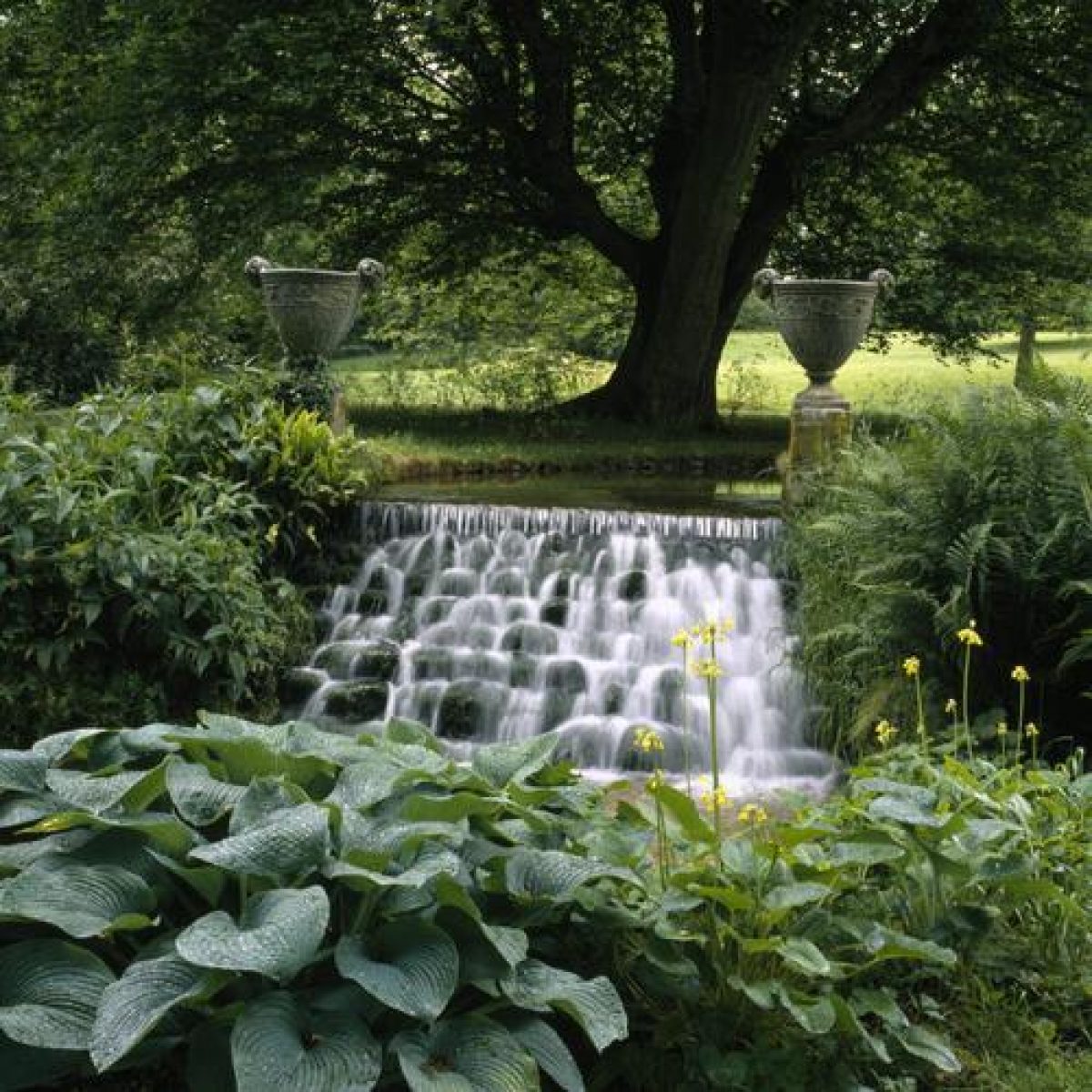 The south lawns extend south-westwards beyond the drive to the site boundary and are planted with a good scatter of mature trees in grass, including exotics. Immediately beyond the drive, some 70m south-west of the house, a spring of medieval origin flows into a 3m wide font in the form of a bowl constructed of rubble flint (C18, listed grade II). The water flows southwards into the Font Stream which follows a serpentine course, edged with waterside plants, over an eight-stepped stone cascade (listed grade II) to join the Test. Its lower course is tree-lined and embellished with two further C18 sandstone urns on plinths (listed grade II) 150m south-west of the house.