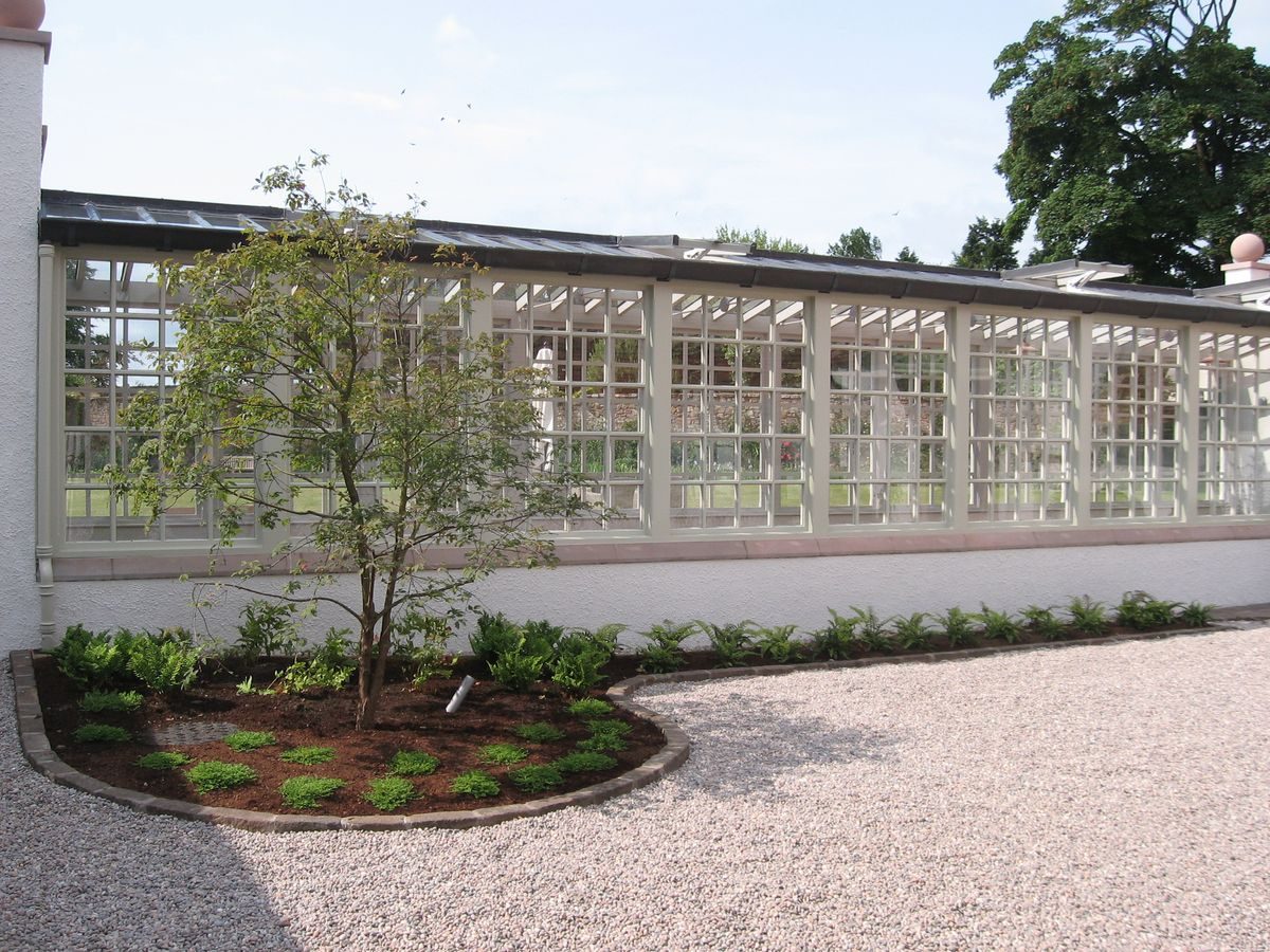 In the 1950s the flower corridor and north-east wing were demolished and a garden, with a new driveway to the house, was laid out by Kate Hawkins, a pupil of Brenda Colvin and well-known Scottish designer.