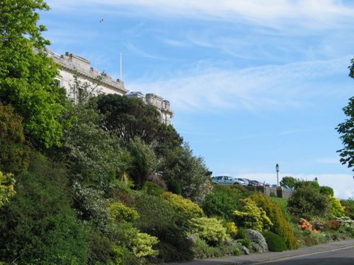 The sloping garden is landscaped with granite steps, a broad terrace, lawn and formal borders. A switch-back drive approaches the National Library of Wales. There is an extensive rockery between the caretaker's cottage and the drive, which is principally constructed with an artificial concrete-based conglomerate.