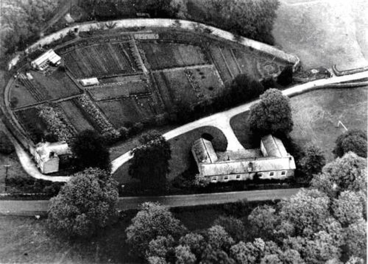 An aerial photograph taken around 1950 shows the walled garden little altered from the layout depicted on the 1909 map. However, there appear to be only two greenhouses, but beds were still planted and trees espaliered against the curved wall. There were originally three entrances into the kitchen garden: one at the south-east corner near the drive, presumably for use by the family, a second from the bothy and the third beside the gardener's cottage. A large entrance has been made in the centre of the curving wall, giving access to classrooms and a hard surfaced play area. Consequently virtually no original features of the interior of the kitchen garden survive.