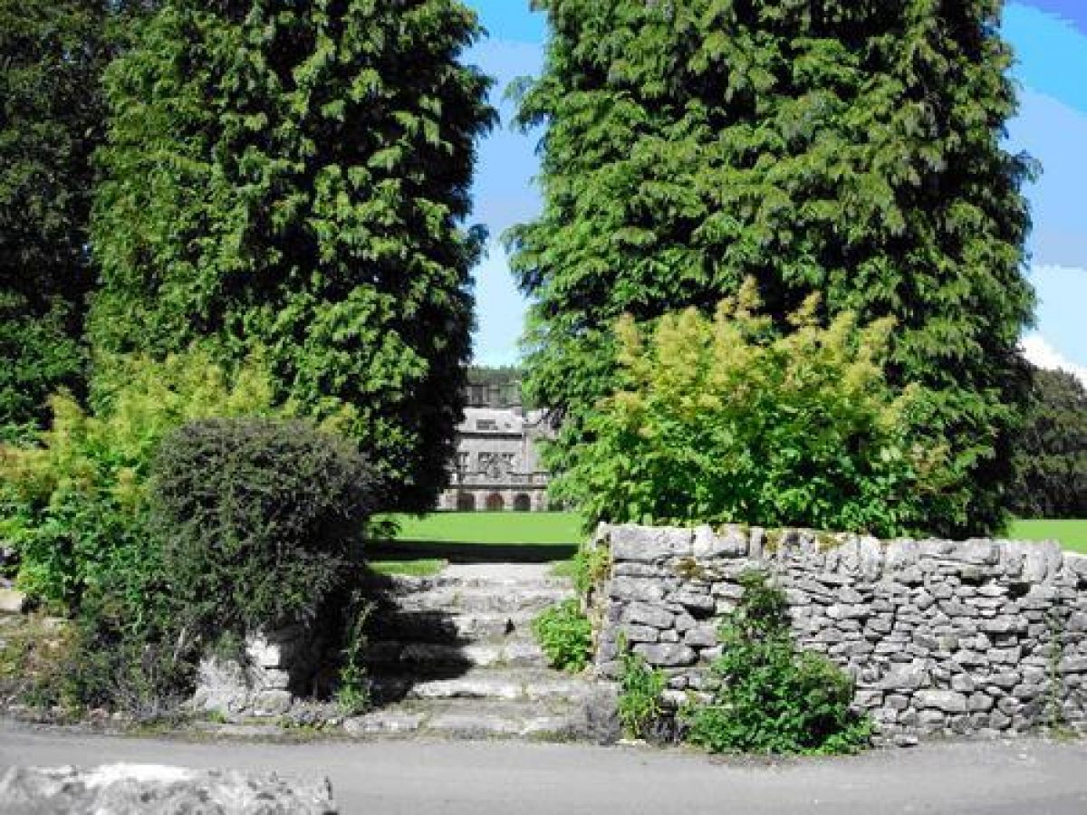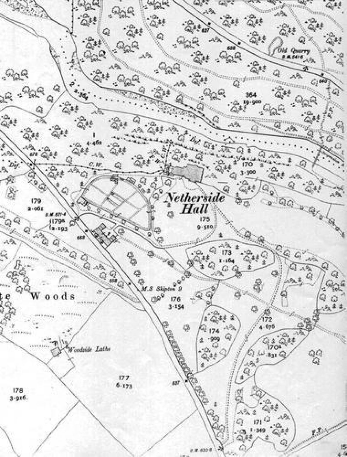 Netherside Hall was originally approached through entrance gates off the Threshfield-Kilnsey road well to the south of the house. These gates are now disused. The drive winds northwards through defined plantations of mixed woodland before turning north-westwards, the view of the house being screened by the plantations. This ensured that the house remained out of the visitor's sight for most of his journey through the park. This surprise view has been marred by a comparatively modern conifer plantation on the east side of the house. The drive crosses, at the half way mark, a now overgrown track running west to the coach house and eastwards towards Threshfield. The present entrance to the hall leaves the Threshfield-Kilnsey road near the stable block, now school rooms, passing between it and the straight wall of the D-shaped kitchen garden before curving to join the original entrance drive. A holly hedge masked the kitchen garden wall from the present drive. Some of the hollies still survive as separate trees.
