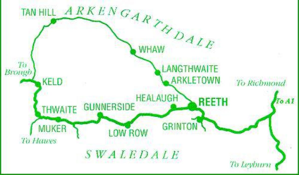 The Swale tumbles swiftly towards Keld, over forces and cataracts, such as Kisdon force, twisting and turning as it cut its way down through the Yoredale series. The valley sides are steep; Satron gets no sun for nearly a month either side of the winter solstice.