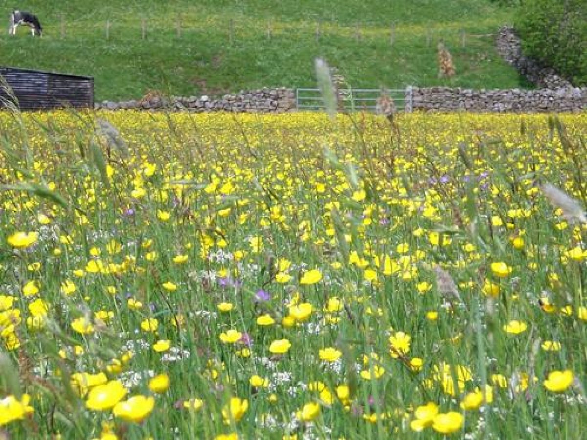 Through the winter, until mid-May, the meadows are grazed mainly by sheep; the flocks are then taken up onto rough pastures for the summer leaving the meadows to grow their crop of grasses and wildflowers for winter hay. Against dry-stone walls and stone field barns, the hay crop first turns yellow with buttercups, then white with splashes of purple, as pignut and cranesbill flower; the lush colour saturates the landscape in sun and rain.