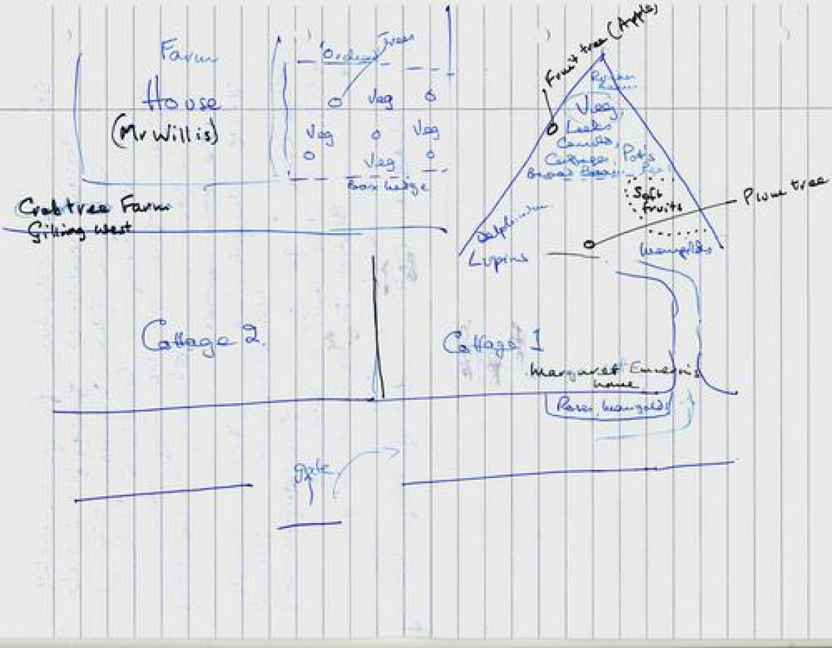 Without knowledge of mortar the walls were once embedded by hand, stone upon stone in a manner so secure that the tradition of dry-stone walling still continues as a method for keeping livestock enclosed and sheltered. Without the walls few plants can grow in the soughering wind; fruit trees and brambles are scarce in many parts of the dale, few of our interviewees can remember them growing around their moorland homes.