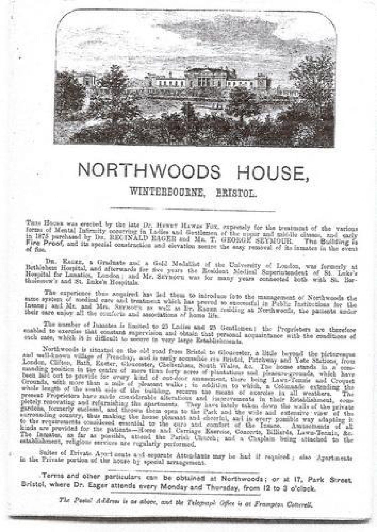 The range of buildings at Northwoods, formerly one house, was built in 1832 for Dr. Edwin Fydell Fox as a purpose-built lunatic asylum. Dr. Fox was born in 1814, the son of Edward Long Fox who pioneered the humane treatment of the insane at Brislington House near Bristol. Tranquility, seclusion and extensive walks were fundamental to Fox's treatment. Brislington was developed as a country estate in parkland for the well-off but lunatic nobility.