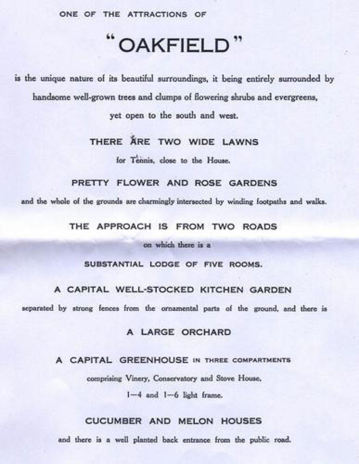 Oakfield (or Oakfields on OS) was a gentleman's Country Estate - originally built in the 1850s and enlarged / enhanced in the late 1800s. When sold by auction in 1913 (see images)it featured - woodlands with formal flower beds and shrubbery accessed by winding paths, an orchard, conservatory, greenhouse and vinery. Also a kitchen garden, cucumber and melon houses. Earlier records note fountains and fishponds.The site is now part of the much larger Chester Zoo which features extensive gardens as well as its animal enclosures. Many original buildings still stand.