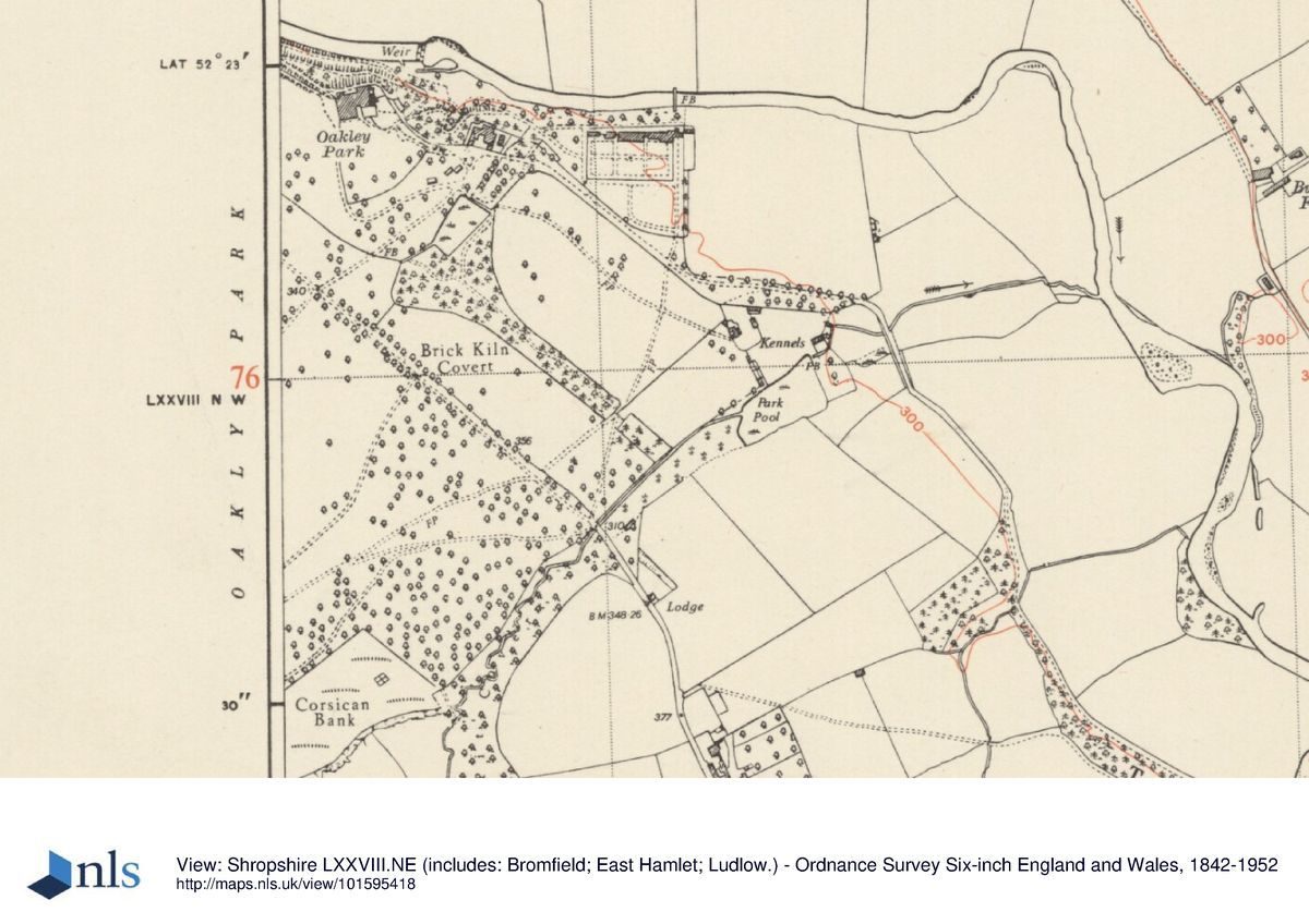 The south bank of the Teme west of Bromfield Bridge is also wooded, including High Trees on the west edge of the park where trees and shrubs were being planted in the early 1780s. Near Cricket Pool (Crickets Pool in 1733), and presumably filled from it, is an icehouse, now blocked.