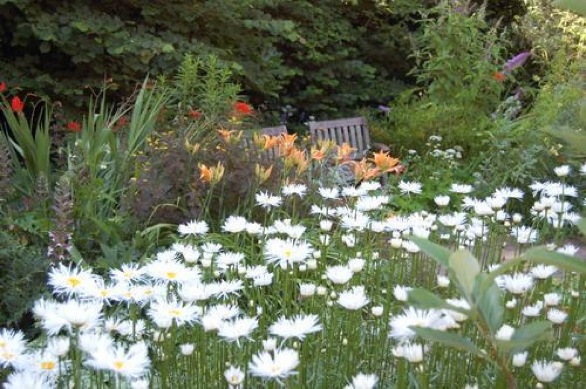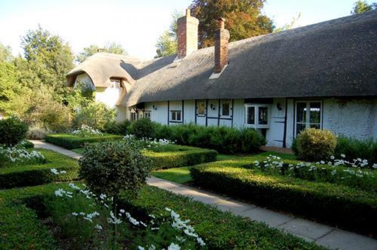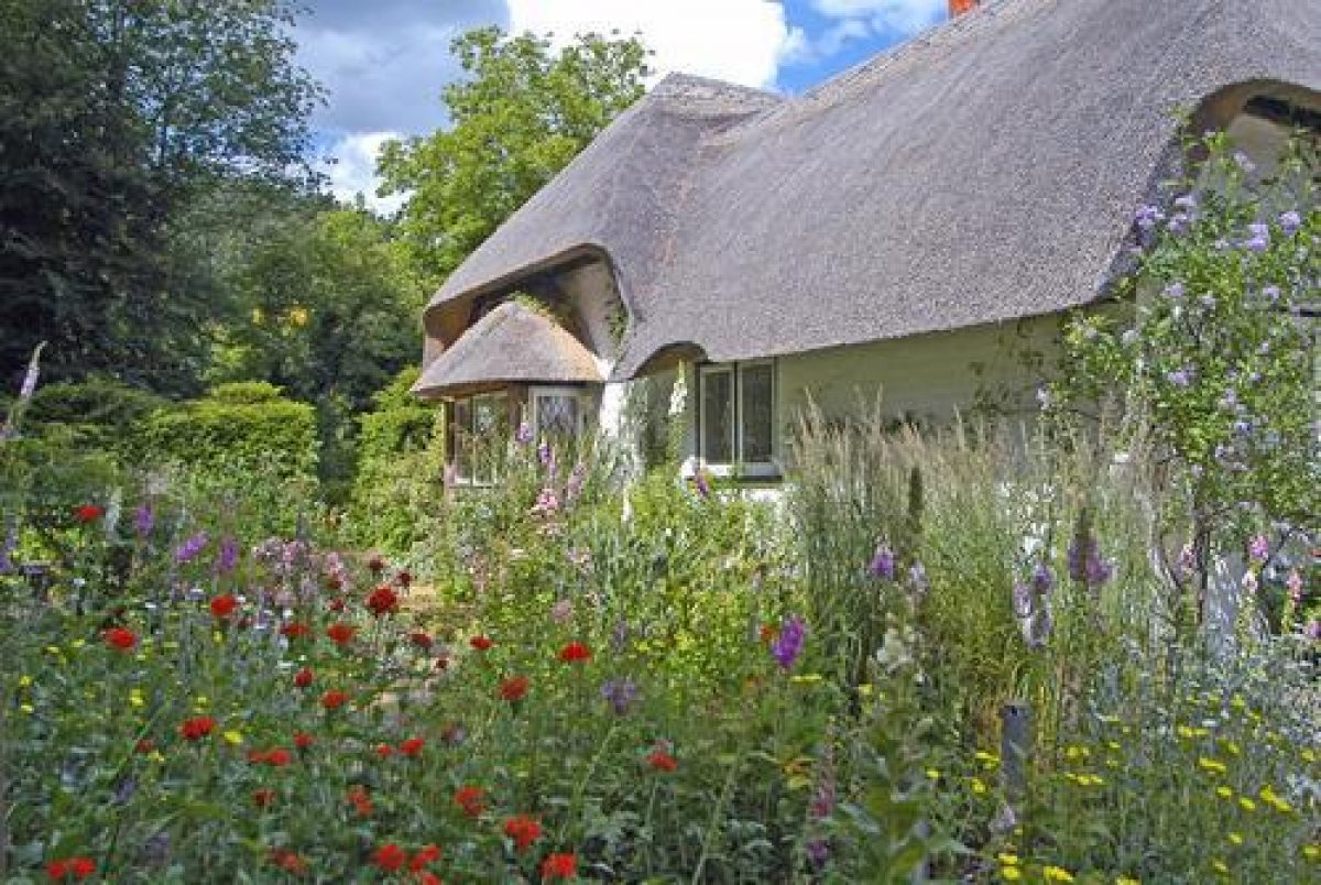 - Description: Although the planting in the cottage garden looks natural, the plan has been to put together with plants which have good colour and interesting foliage. Many of the plants are familiar cottage ones such as honesty, lupin, aqueligia, cistus, foxgloves and verbascums. At one side of the garden, Rosa `Mme Alfred Carriere? dominates the arbour. The flowers which are ivory coloured with a flush of pink have a delicious scent. This garden faces south but there is some shade from the beech, ash and acer trees. A line of hazelnut trees provides shade for a mixture of ferns and other shade loving plants such as Aconitum and Dicentra. The hazels were traditionally planted close to cottages as a useful source of food. Just outside the cottage is the well and on the wall by the doors going into what used to be the stable are old hasps for the stable door. The cottage garden is designed around the small circular pond built by Enid Blyton. The curves and circles of the garden echo the curves of the thatch.