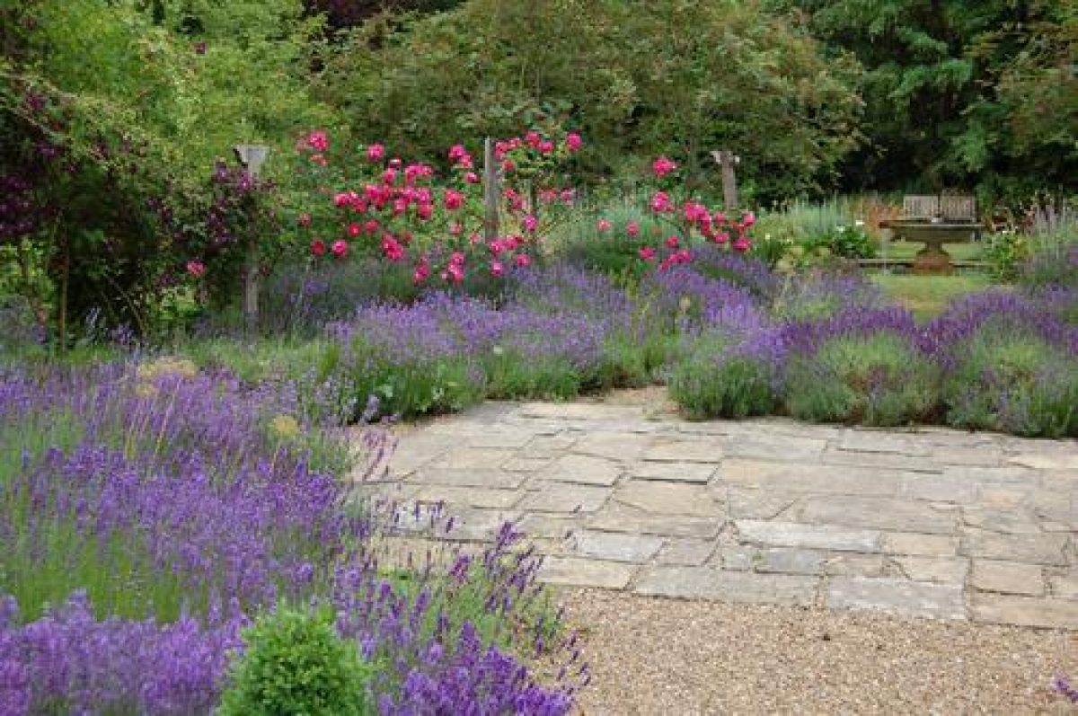 - Description: Surrounded by the remains of posts which formed the original arbour, this terrace is planted with lavender and alliums which together produce an effect of clouds and spheres. When the alliums have gone over, the seed heads turn a pale oat colour which is set against the vivid blue as the lavender comes into flower. The terrace is a crossroads for the Water Garden, the Rose Walk or the Cottage Garden. Surrounding the Lavender Terrace, the old arbour supports roses and clematis. These create a semi-transparent curtain through which glimpses of the gardens beyond can be seen.