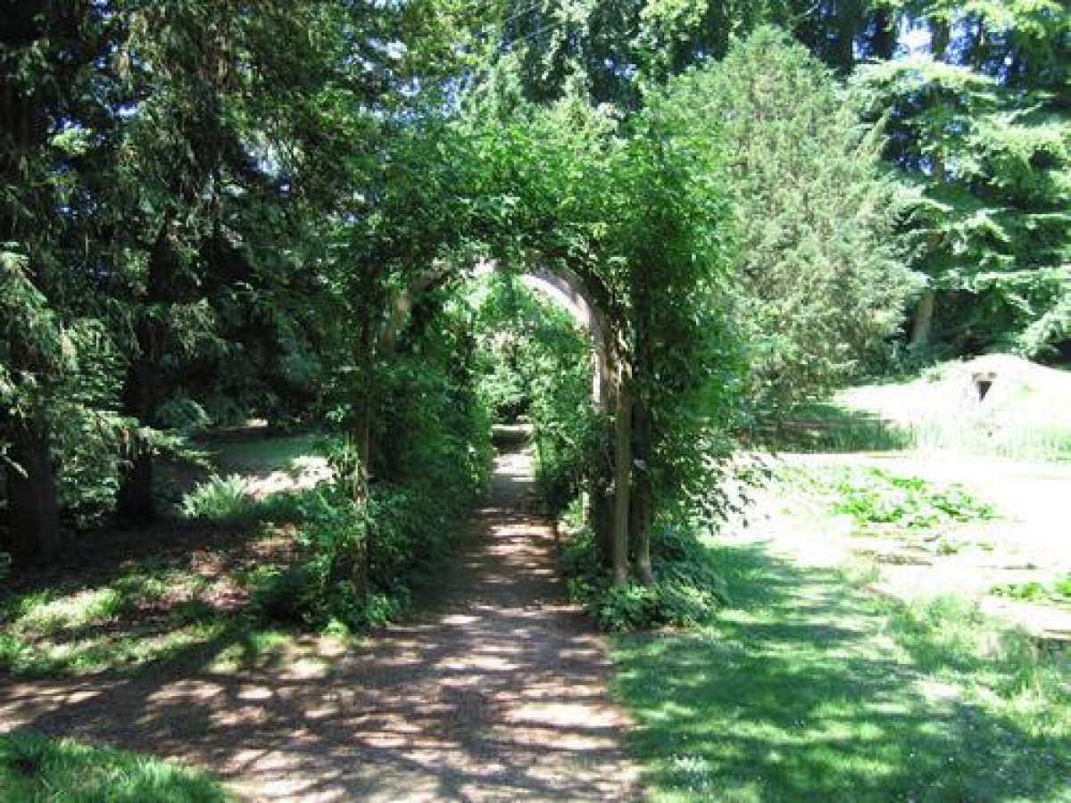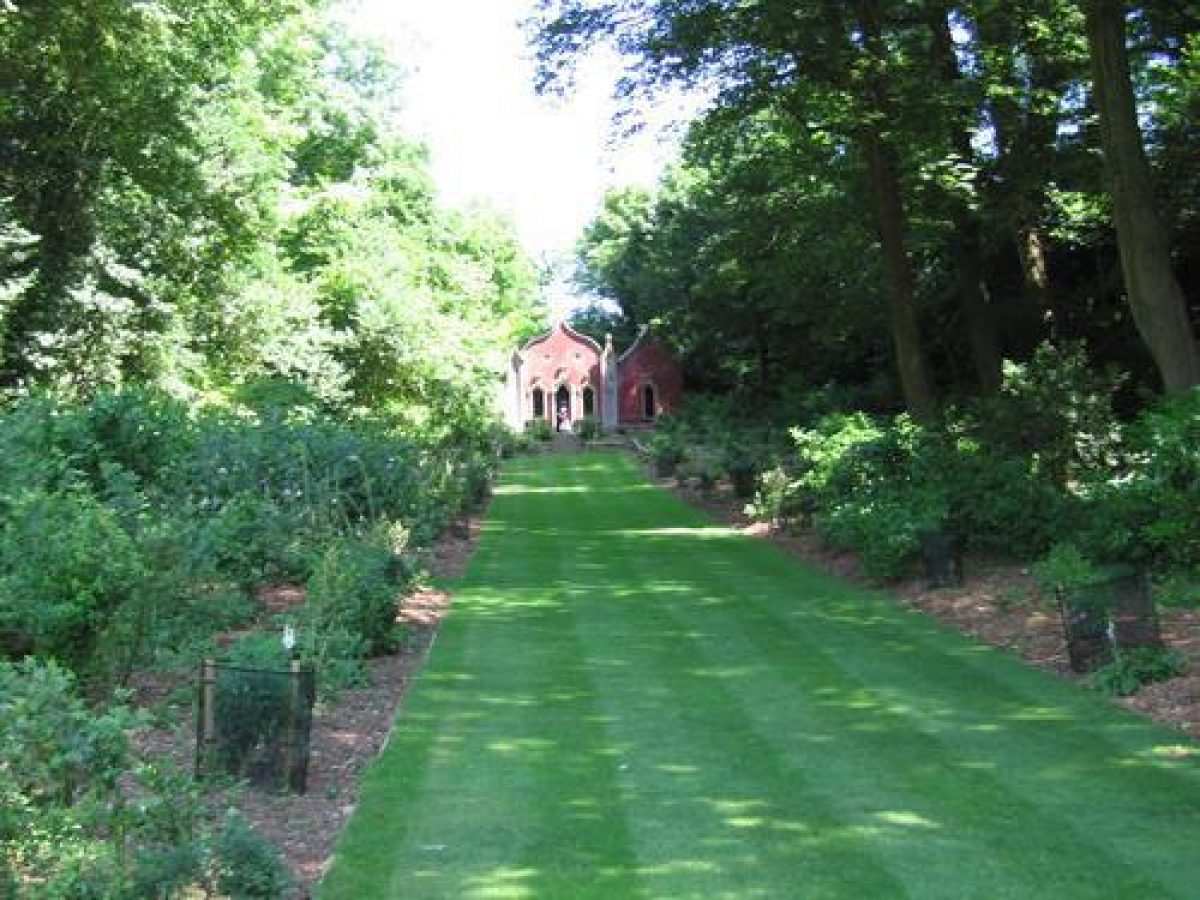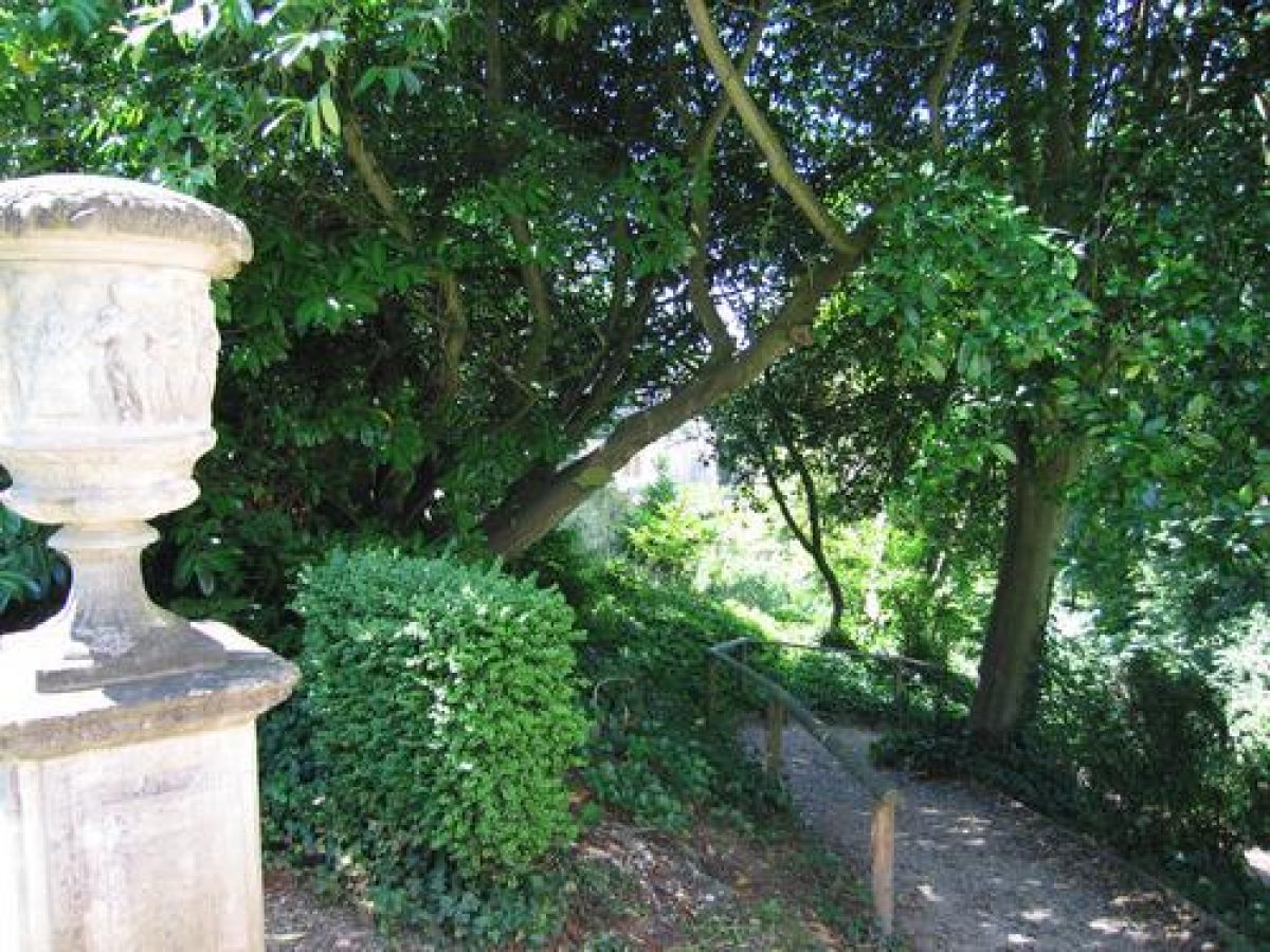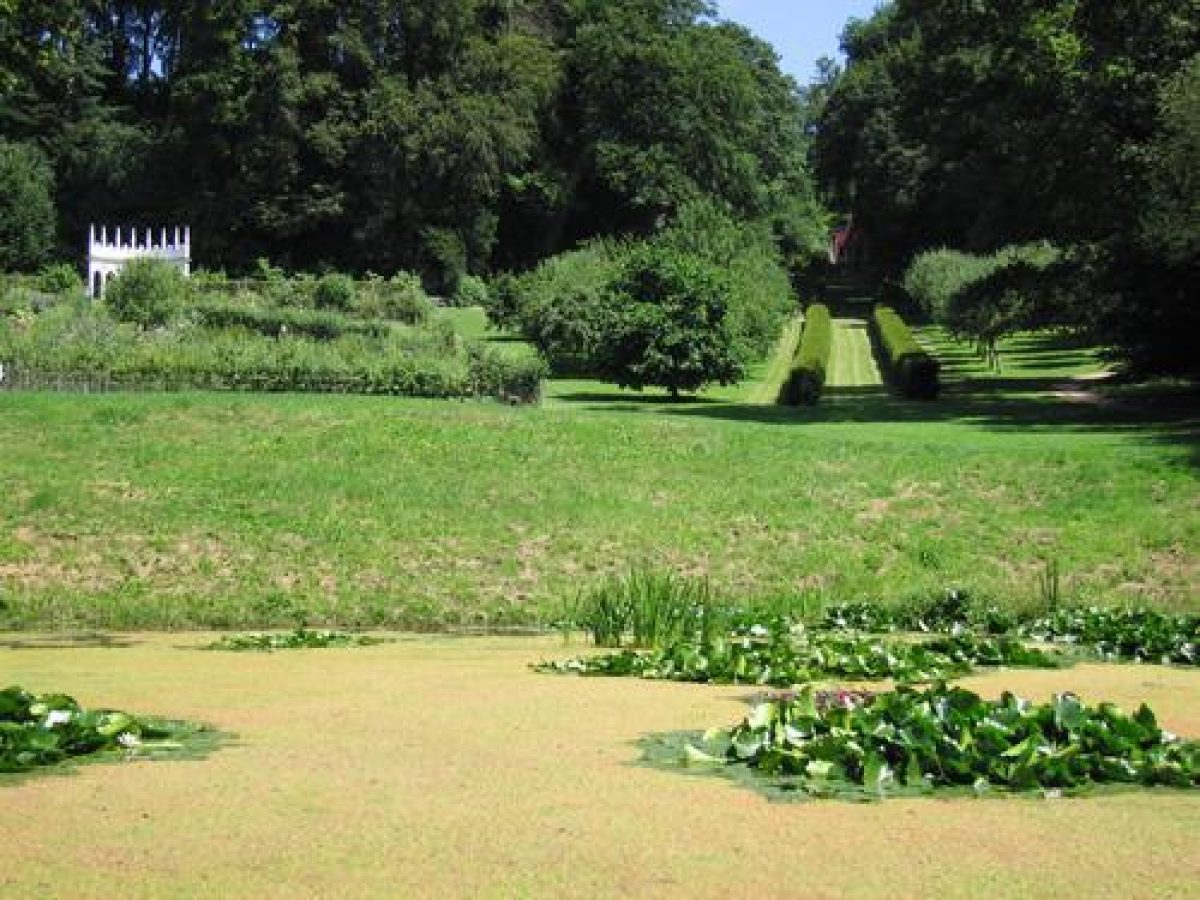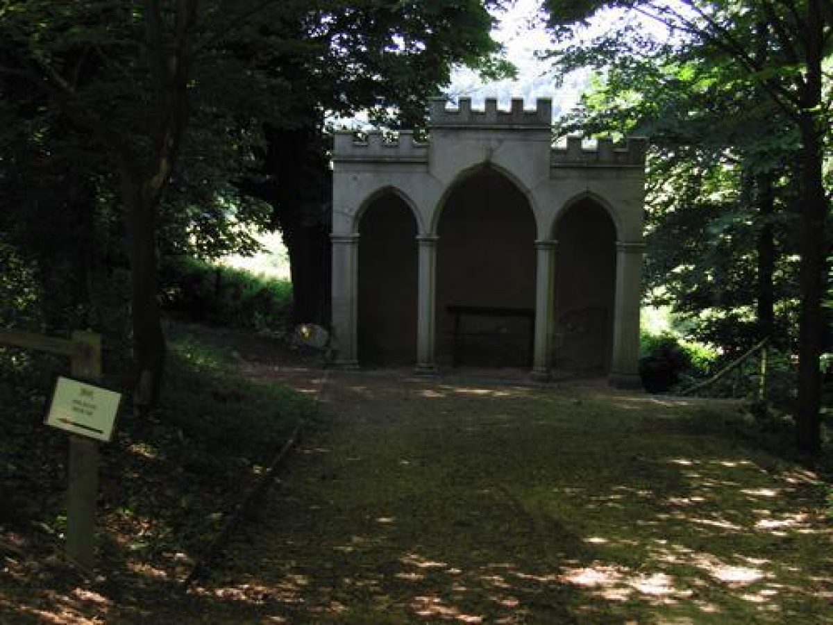 Below the pond the valley-bottom stream, now at the surface, falls down a narrow cascade and then south-west to the end of the valley garden, here wooded, 150m south-west of the pond. The path is carried south-east across the head of the cascade and then south-west to a triple-arched gothic seat, the Gothic Alcove (present 1748, listed grade II*), at the southern extremity of the valley. This looks north-east, up the straight and uphill-sloping Beech Walk (replanted after the original beeches were felled in 1977) which runs up the south-east side of the valley. In 1748 the rustic Hermitage stood in the woodland below (west of) the north-east end of the Walk; a slight platform probably marks its site.