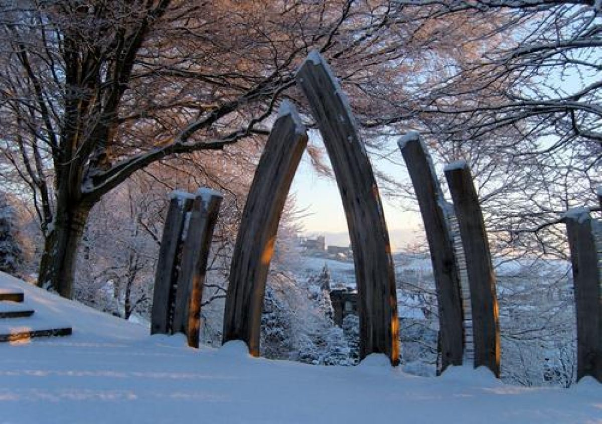 - Description: The Commemorative Garden. A quiet, reflective corner of the park with views through oak arches to Whitby Abbey. Sunderland glass bricks set in the arches represent the stained glass windows of the Abbey. 'We will remember them' is inscribed on sandstone walling.