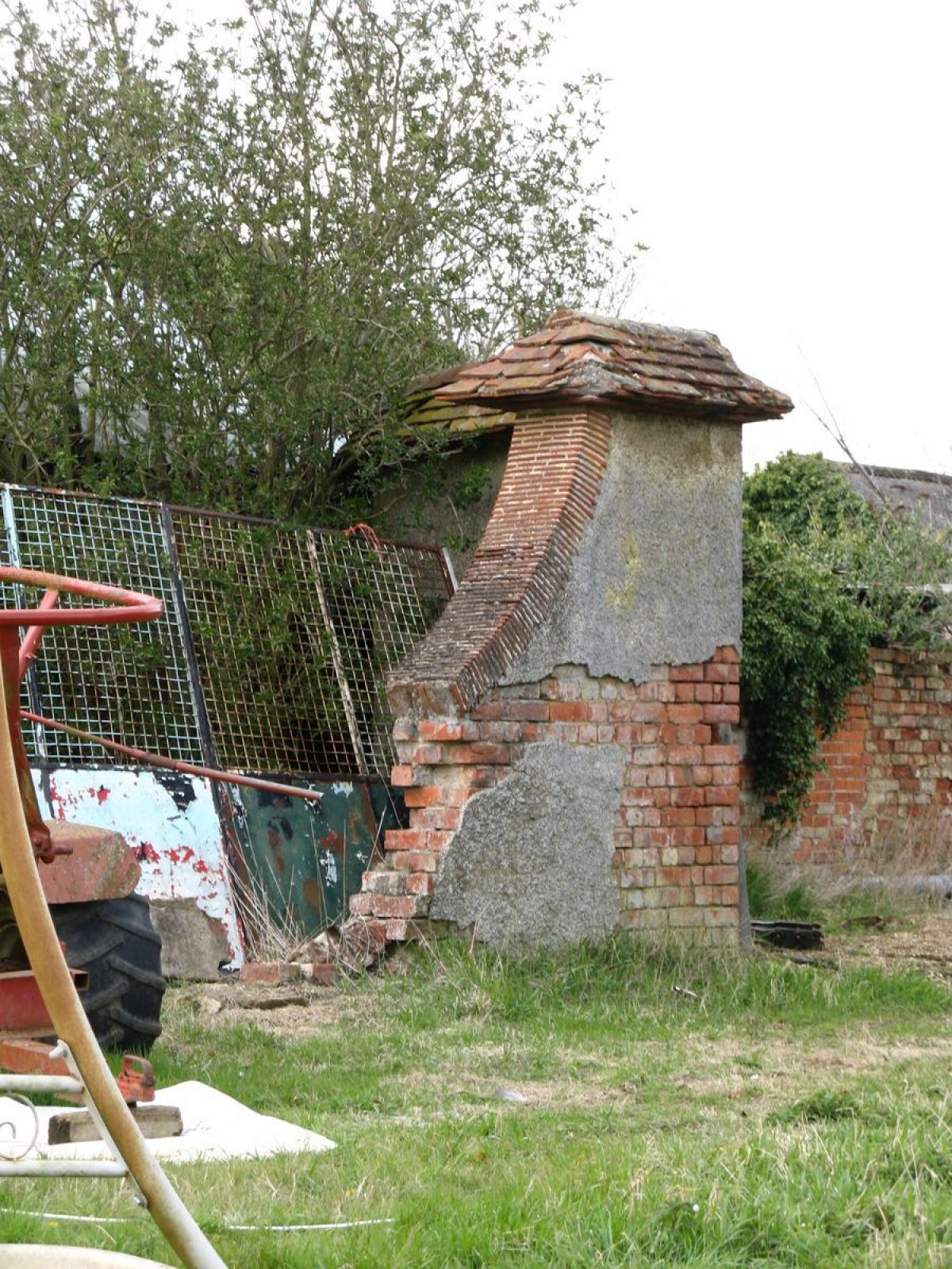 - Description: The gate pier, originally one of a pair, is of ashlar, intersected every two courses with narrow bands of red tiles. It has a moulded top. Originally, both gate piers were surmounted with lead statues. Gertrude Jekyll described them thus in “Gardens for Small Country Houses”: “A very attractive pair is the leaden Youth and Maiden dressed in eighteenth century costume that nod and beckon to each other from neighbouring gate-piers at Papillon Hall. They are only about four feet high and of a type suitable for comparatively small, though not for very small gardens. They will be recognised as little cousins to the well-known Watteau-like Shepherd and Shepherdess who simper at each other in the solemn atmosphere of the South Kensington Museum.”