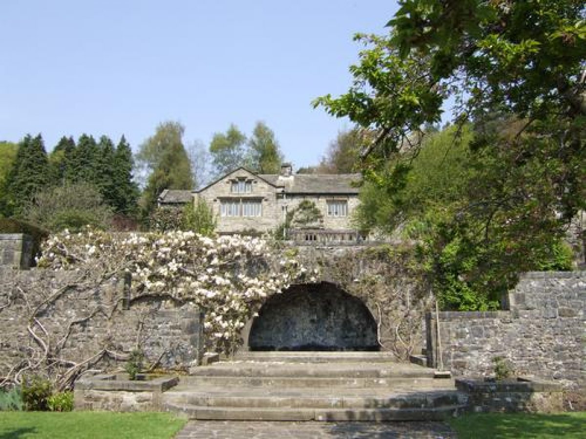 From the outer courtyard the rest of the gardens are reached via the Chapel Garden. The Chapel Garden is a formal enclosed compartment laid out with a cruciform pattern of stone paths dividing beds to the east of, and overlooked by the small chapel built by Sir William when he bought the site which stands 30m west of the Hall. A formal, stone, stepped cascade runs down the bank from the north, into a semicircular pool (known as Half Moon Pond) set in the paving. At the north-west corner of the Chapel Garden a flight of steps leads up the bank to the extensive Rock Garden which occupies the hillside immediately north of the Hall. The Rock Garden is laid out with a series of pools around which paths wind northwards, and occupies an area of limestone which was stripped of its top soil and exposed by Sir William in order to create conditions suitable for alpine plants. The water is piped from a nearby spring and supplies the Hall and water features in the gardens below. At the north end of the Rock Garden a path continues northwards up the steep hillside through woodland to the northern tip of the site, to reach the Cliff Walk. This Walk overlooks Skyreholme Beck in the valley to the west and Trollers Gill to the north. The path returns south through the orchard, lying 50m north-west of the Hall, which is planted with mature fruit trees. To the south-east lies the Rose Garden, a series of rectangular rose beds divided by gravel paths, laid out by Sir William and remodelled in the 1990s. On the north side of the compartment stands a stone garden pavilion with a stone roof, overlooking the Rose Garden.