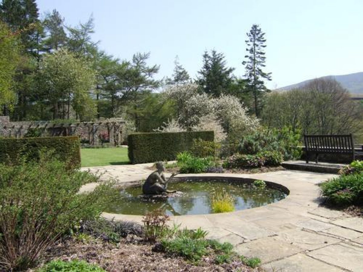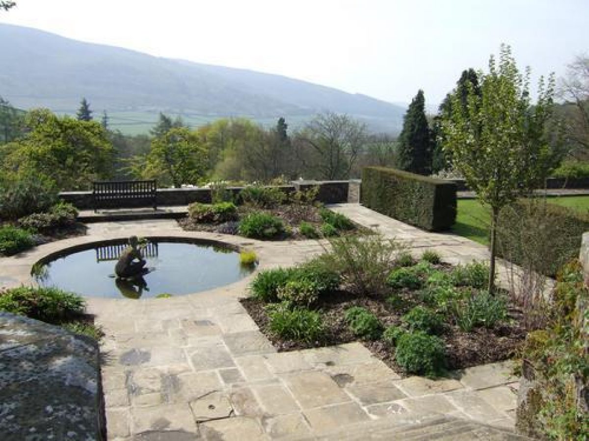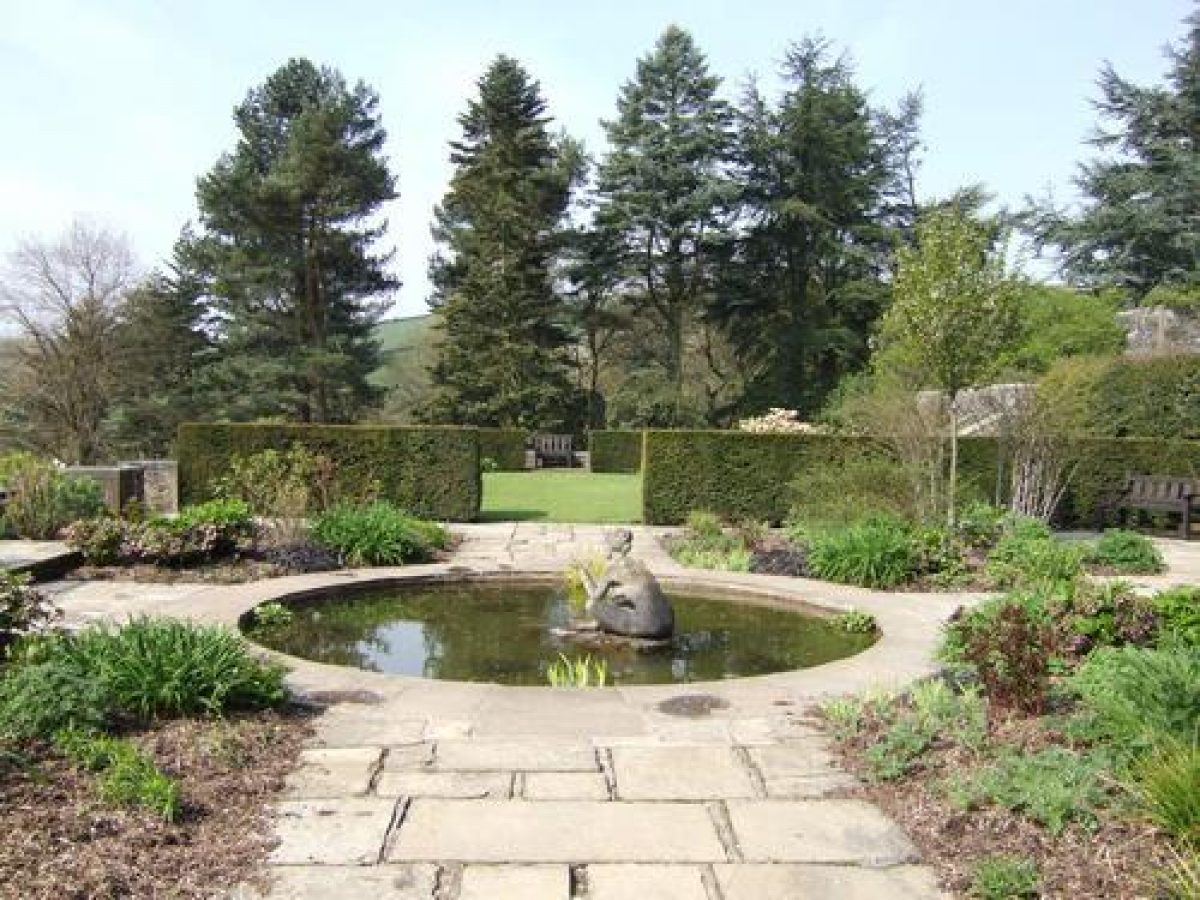The chapel garden is a formal intimate garden. At its west end is the asymmetric hexagonal chapel Sir William built for his own personal use. This has floor to ceiling windows on two sides, enabling the chapel and garden to seem as one and from which the beautiful vista of Simon's Seat could be seen. Directly opposite to the entrance to the drive near the outer courtyard is a formal small stone stepped cascade over which a stream from the rock garden gently falls into a semi-circular pool below.