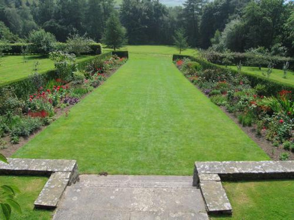 The top three terraces were laid out by Sir William in the late 1920s and early 1930s. The 1909 OS map shows that before his work a terrace ran along the south front of the Hall, with a roughly square compartment adjacent to the south of this, probably a kale yard. Sir William retained and embellished the top terrace and created the two below in his initial campaign. The fourth terrace was laid out during the 1950s, also under his direction (Makin 1989). The Ploughings were ploughed up during the Second World War for vegetables.