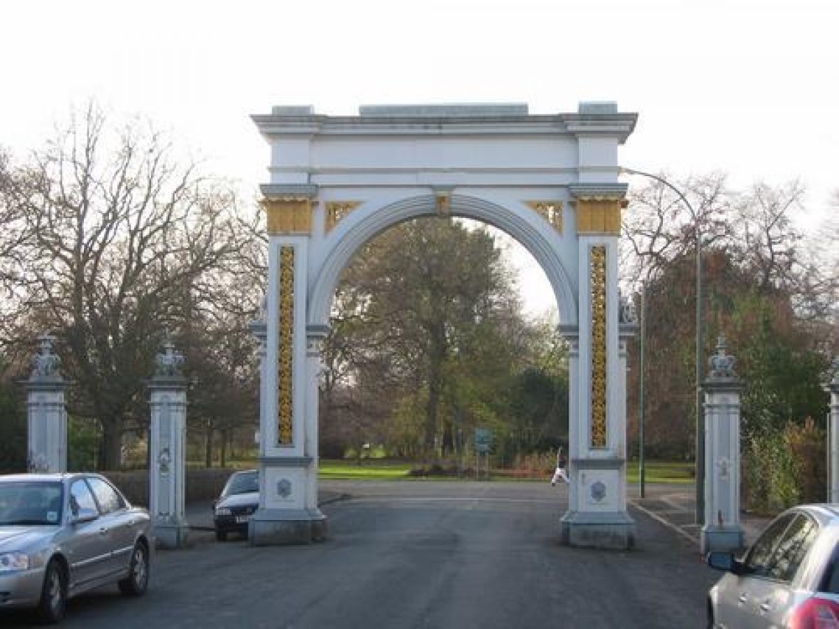 - Description: The ornamental gateway at the eastern entrance to the park, from Pearson Avenue / Beverley Road. The elaborate cast-iron archway and gates were created in 1863 by the firm of Young and Pool. The original gates were removed during World War II but the archway remains.