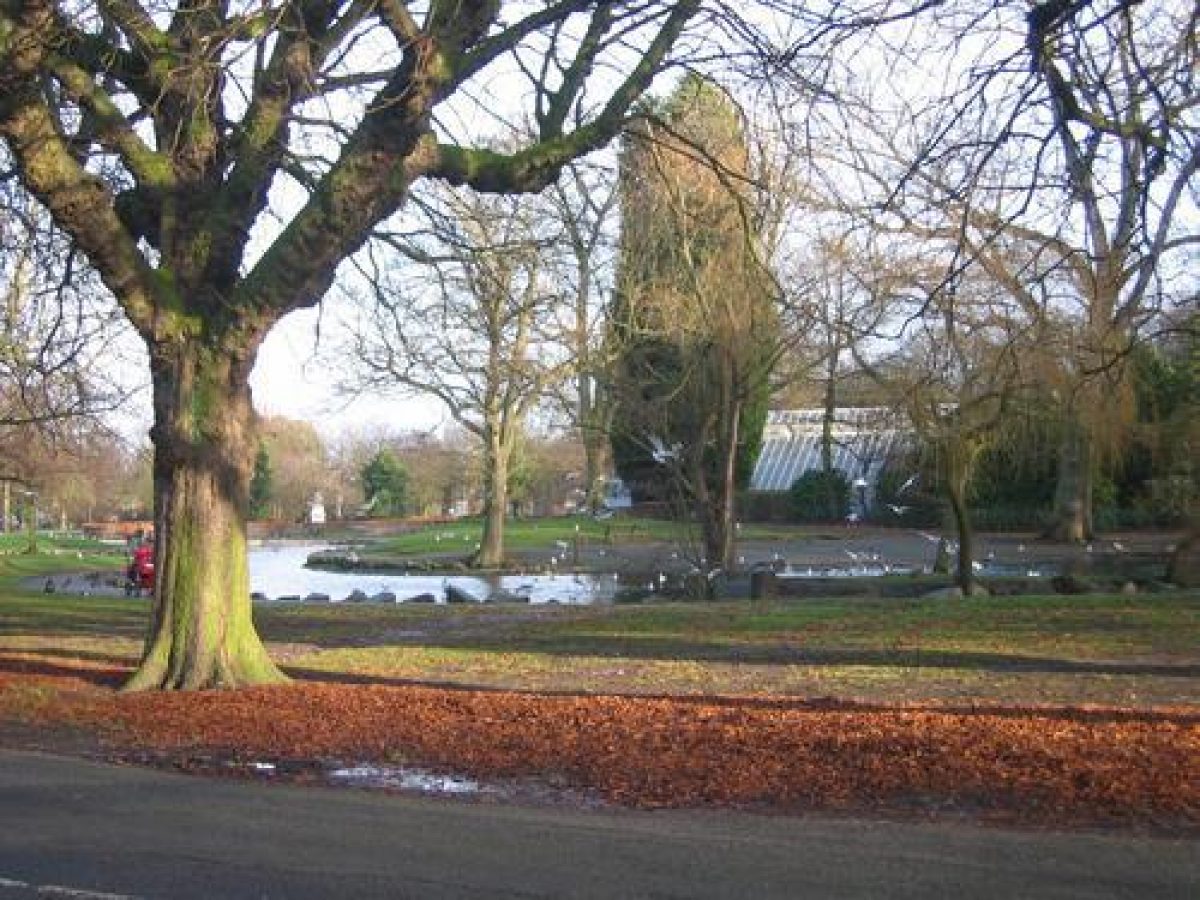There are bowling greens and a modern pavilion, boarded up to prevent vandalism, at the south eastern corner. On the south side are formal flower beds, surrounded by iron railings, an arboretum and a conservatory. The conservatory was originally built in the late 19th century and rebuilt in 1930. It is now covered in metal sheeting to prevent vandalism.