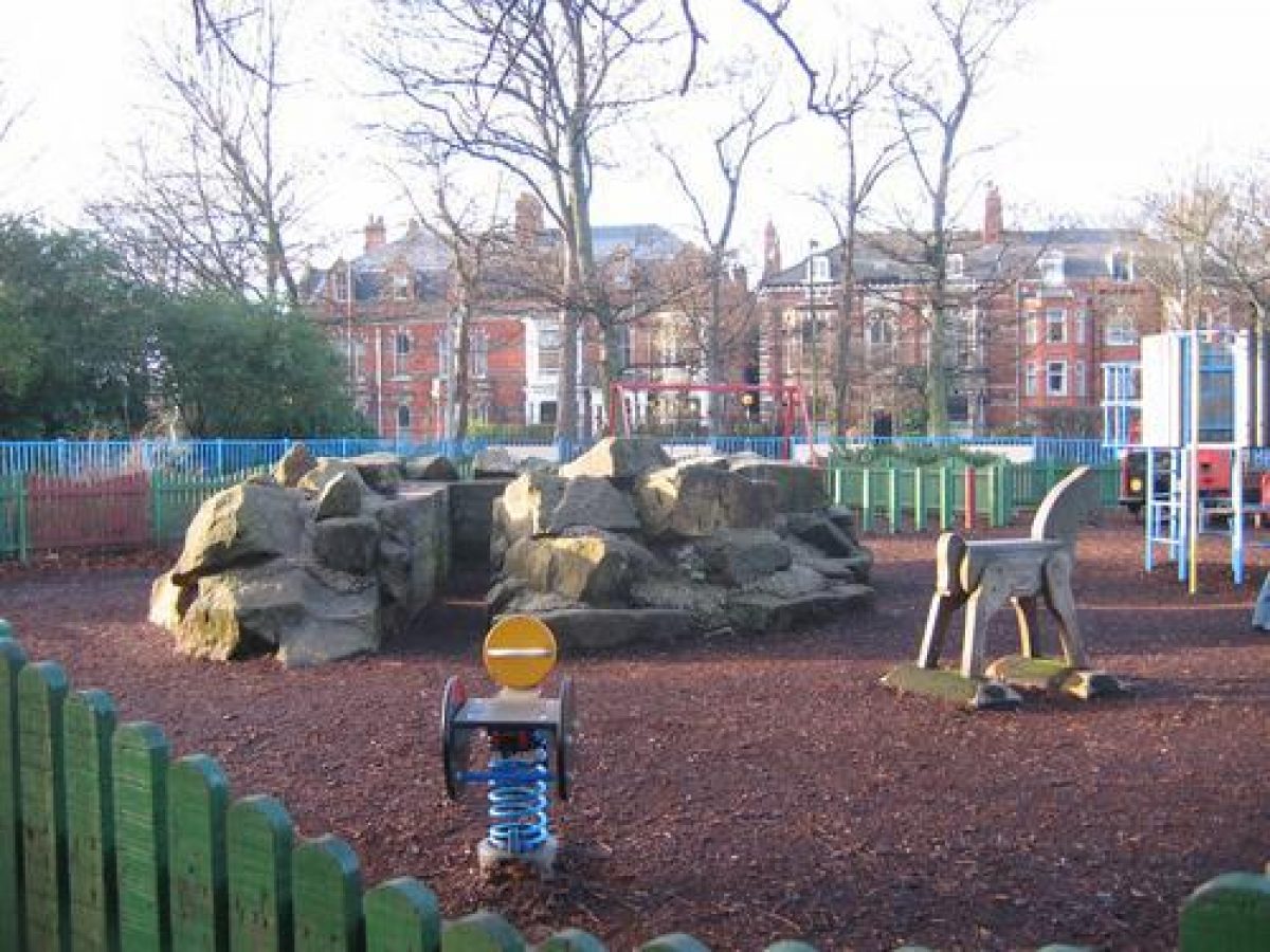At the western edge of the park is a large children's play area which has been on this site since about 1950. The play equipment is relatively modern, having been replaced in 1990, although there is a rock pile with passages through it which has been there for over 50 years.