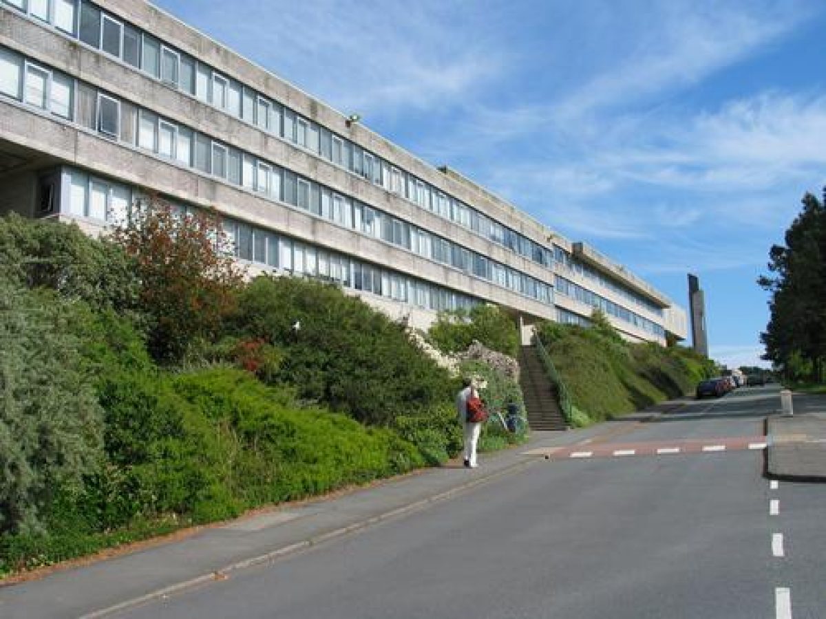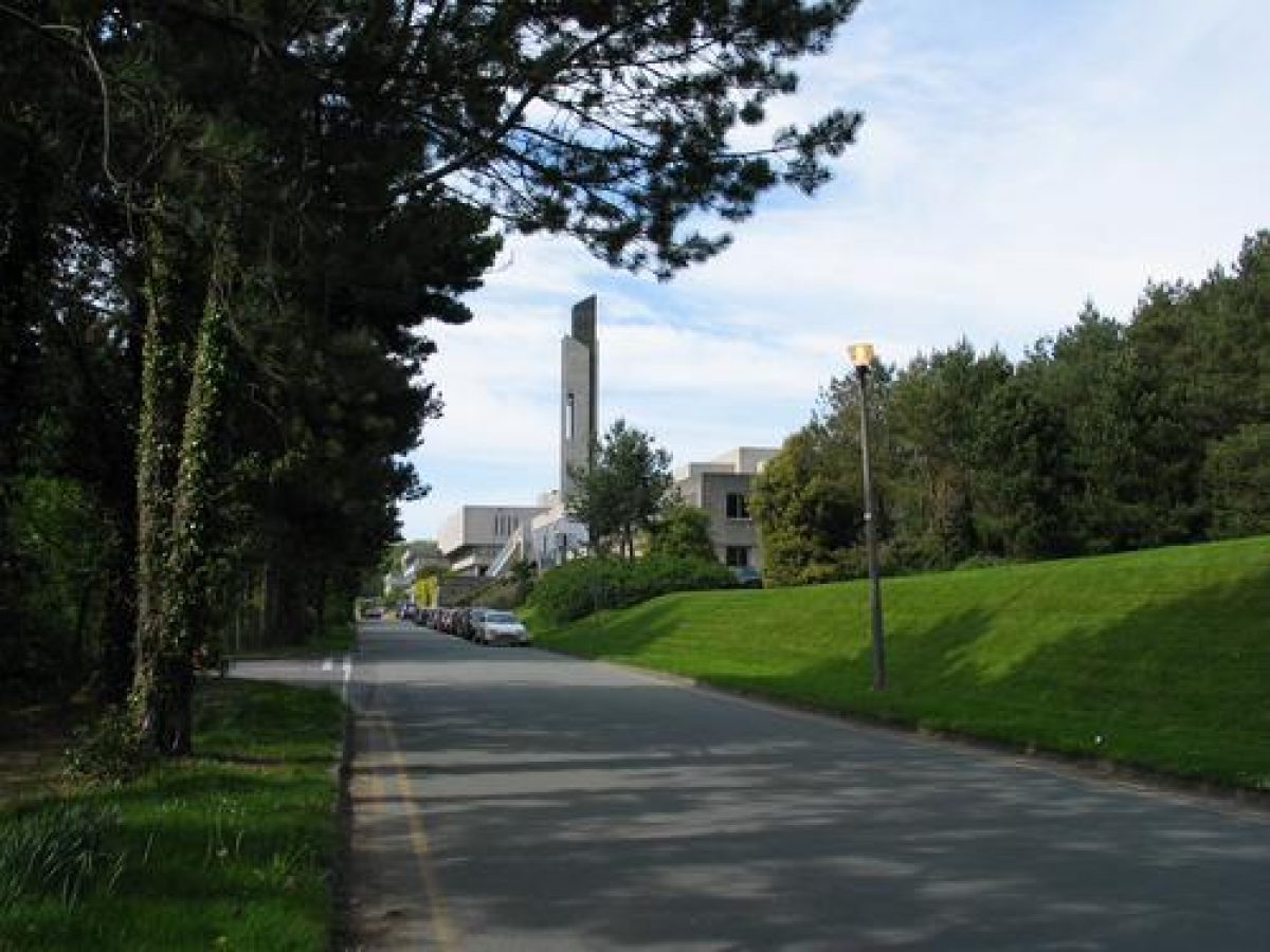 The whole campus has been extensively landscaped with planting chosen to complement the modern buildings, to suit the exposed and windswept sloping site, and to tolerate the salt-laden air.