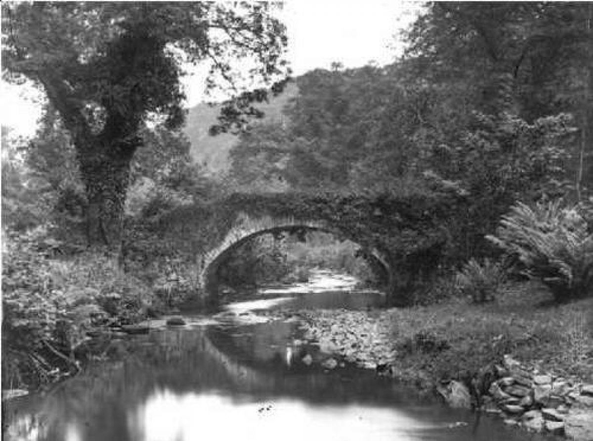 - Description: This feature is the stone-arched bridge, which is probably an older construction than the waterfall. Apart from the footings, which partially support a modern, derelict bridge whose chief function is to carry a foul-water sewer, the original structure has been demolished. With paths converging on it from both flanks this bridge was the main river crossing in the Upper Valley and its picturesque, rubble-built, construction near the waterfall made it another favourite subject for John Dillwyn Llewelyn's camera.