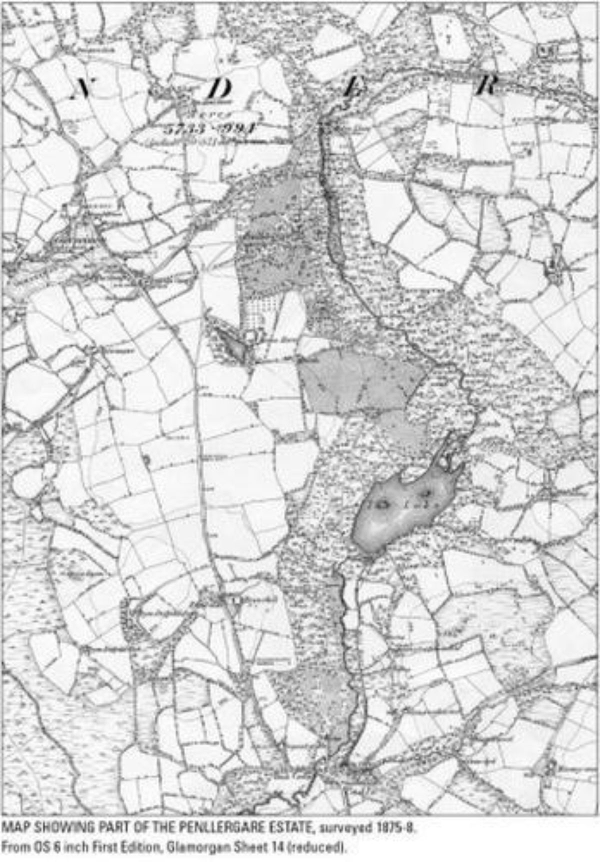 - Description: This feature is the plateway. One of John Dillwyn Llewelyn's photographs depicts what might be a plate or tramway laid along the western (home) bank of the Upper Lake. The 1st Edition of the 25" Ordnance Survey indicates a track running from the boathouse, northwards to the Melin Llan road bridge, and it would be logical to assume an extension beyond to a coal pit also shown on the plan. Other than a faint terrace between the M4 and Melin Llan bridges (the latter of which has a small arch on the same line) there is now no other trace of this enigmatic feature.