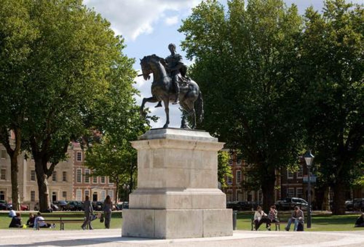 - Description: This is a bronze statue of William III on horseback, dressed as a Roman Emperor in triumph. It is on a stone pedestal. It was thoroughly restored in 1947.