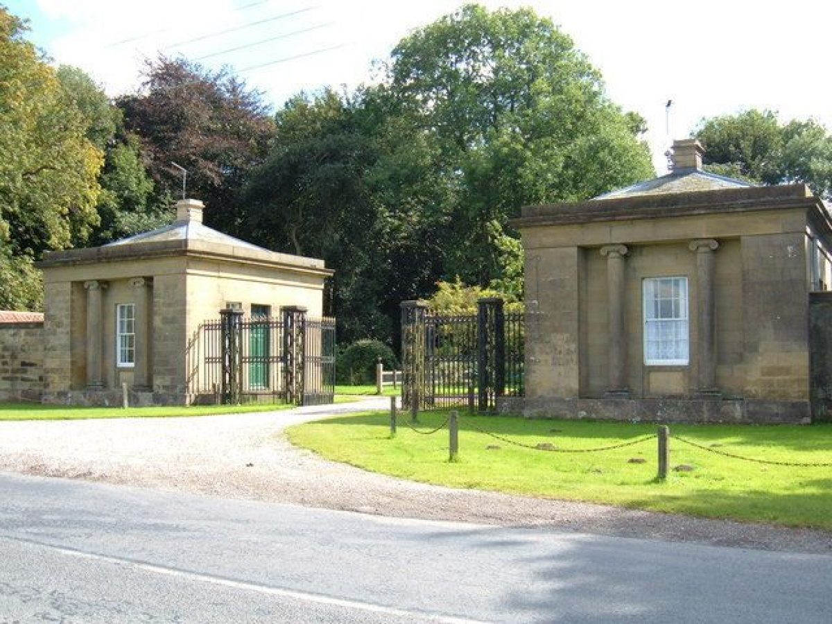 - Description: On the road that forms the northern boundary of the park stand a pair of Neoclassical stone lodges with curving screen walls, ornamental iron gatepiers and elegant wrought-iron gates and railings. The square lodges were almost certainly built around 1818 (when the Rise Hall was under construction) to the designs of Watson & Pritchett.