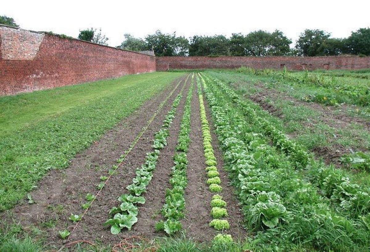 - Description: The former kitchen garden lies north of the hall and parkland, on the opposite side of the road. It is shown in this location on the mid-19th century Ordnance Survey plan, and in more detail on the 1910 Ordnance Survey plan. There were glasshouses in the western section.In 1999 a small commercial firm, Slater Organics, took over the abandoned kitchen garden, and it is now used for growing organic vegetables.