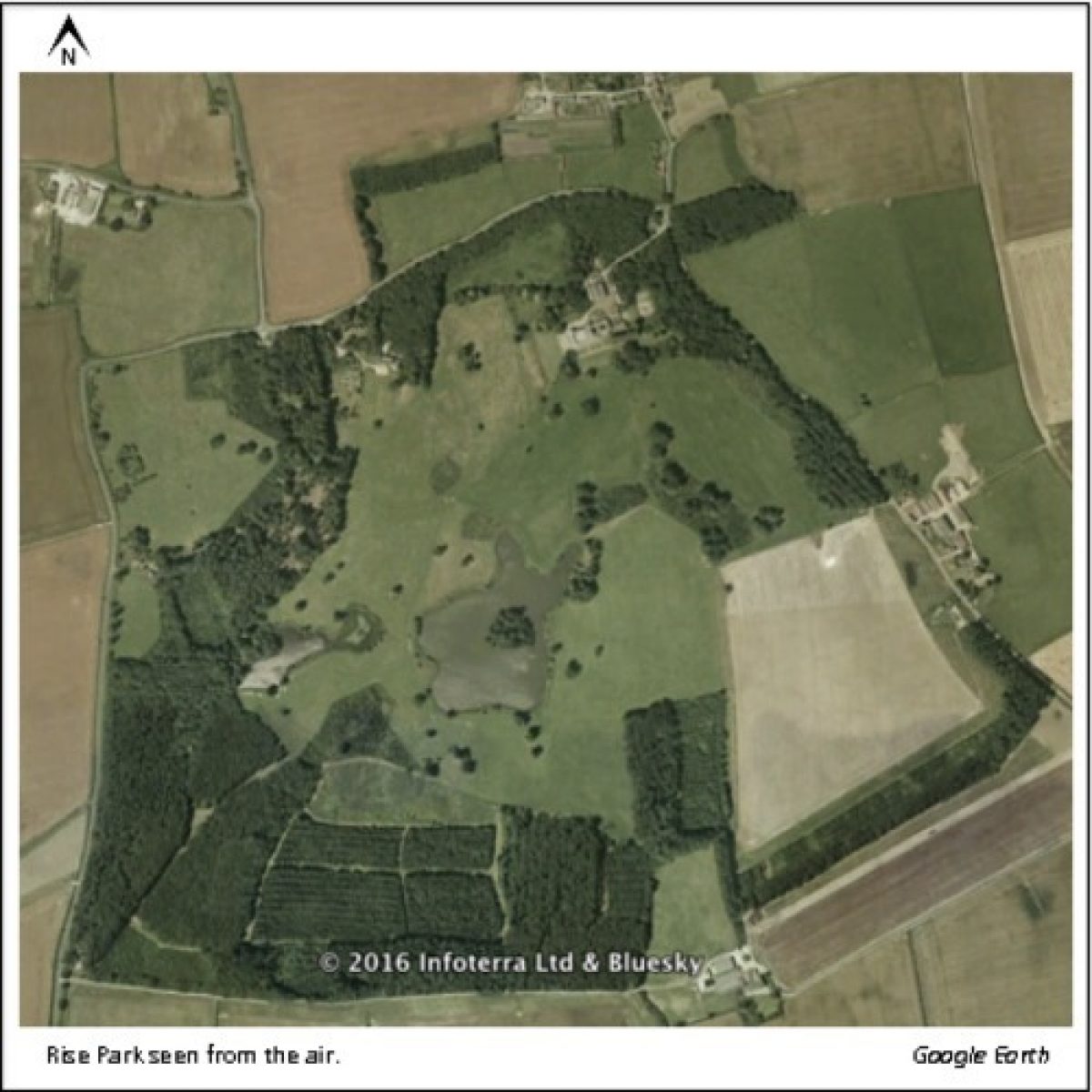 The historic parkland, including Rise Wood, is bounded by roads on three sides. On the west side, beginning at South Lodge, the B1243 runs north past Rise Wood and Blackhall field; it then bends to run east as far as the entrance lodges to Rise Hall. At this point the road forming the northern boundary of the park ceases to be part of the B1243 (which goes north at this point) but continues as a minor road, running past the church of All Saints, then alongside Church Walk Plantation to East Lodge. It then runs south along the eastern boundary of the park past Park Farm and the Round House. The plantation called Dawson's Belt may be regarded as part of the southern limit of the historic parkland (although the area to the north of the plantation, part of ‘Old Park', is now under cultivation). The southern edge of Rise Wood marks the rest of the southern boundary.