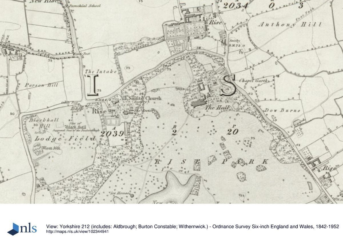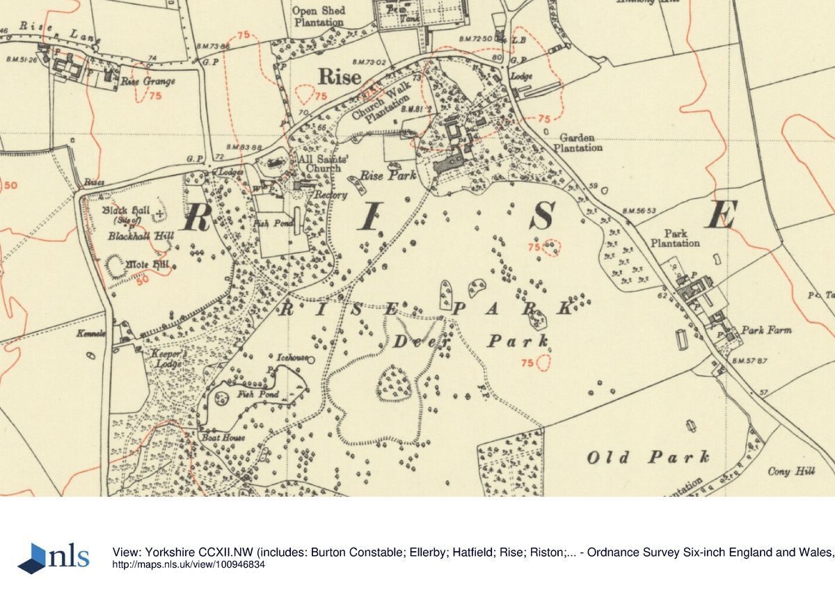 In 1856 Rise Hall was said to stand in ‘a fine park, beautifully ornamented with timber. About 300 head of deer occupy 130 acres; there are 120 acres of wood; and the fish ponds occupy 20 acres.' (Sheahan & Whellan, York & the ER II, 428). The deer were dispersed at the start of World War 2, when the parkland was temporarily ploughed up. (Neave, Medieval Parks, 48). In other respects there has been little change since the mid-19th century.
