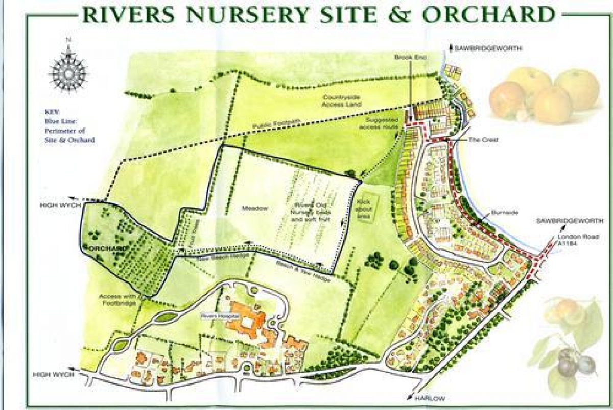 The Rivers Nursery Orchard is now a Community Orchard, restored by volunteers over the past 15 years. Although the site is not generally open to the public, public footpaths do cross the site. Access to the site for activities organised by the Rivers Nursery Site and Orchard Group is by the invitation of the East Hertfordshire District Council as landowner.
