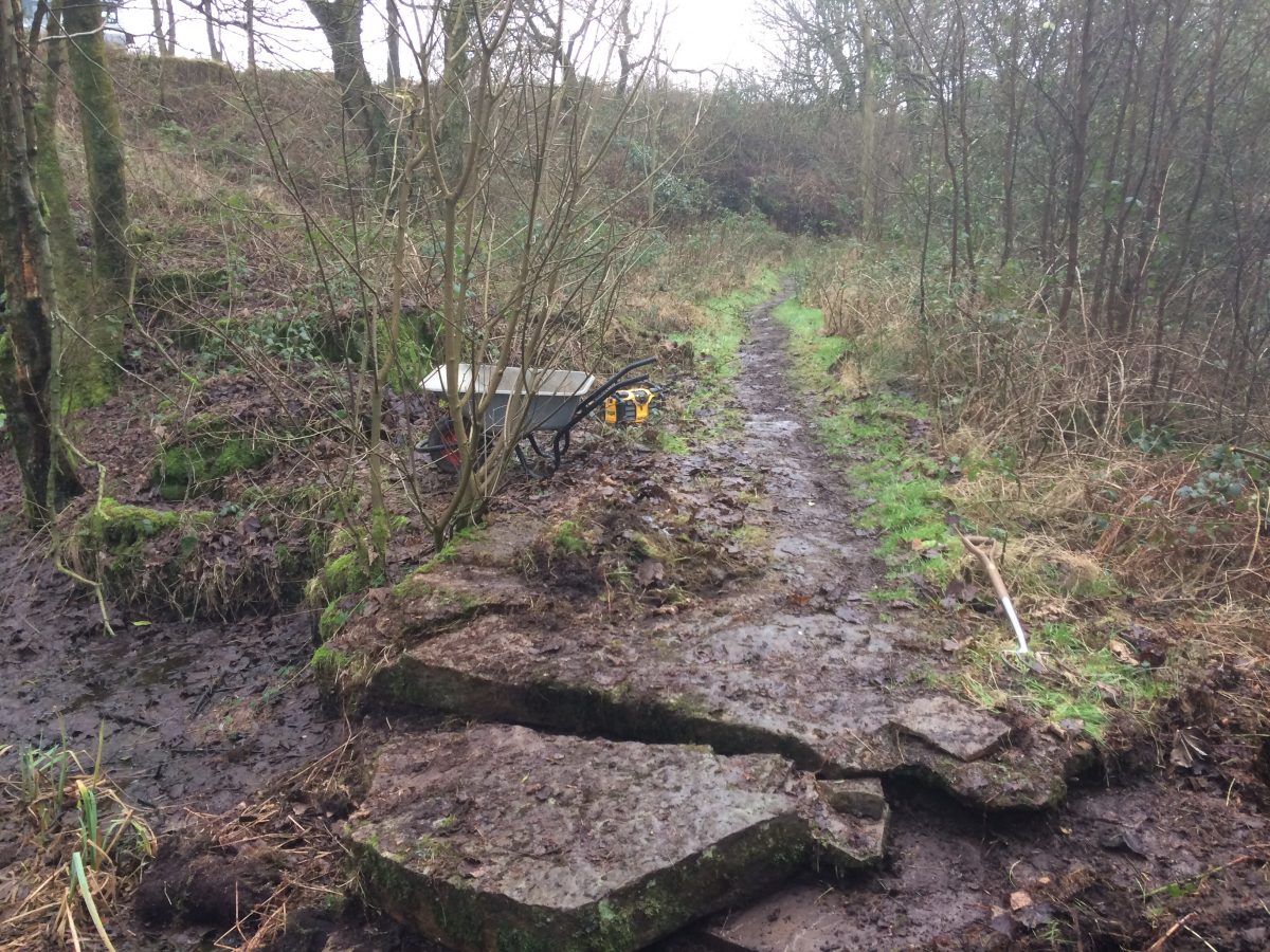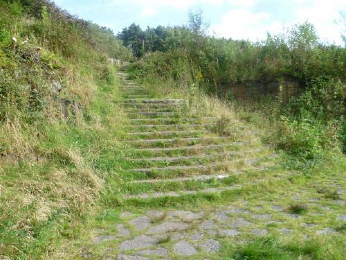 - Description: Terrace paths formed from irregularly-shaped and set flags, dressed rubble walls, flights of stone steps.