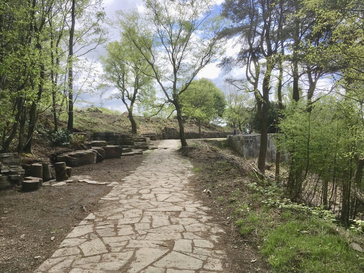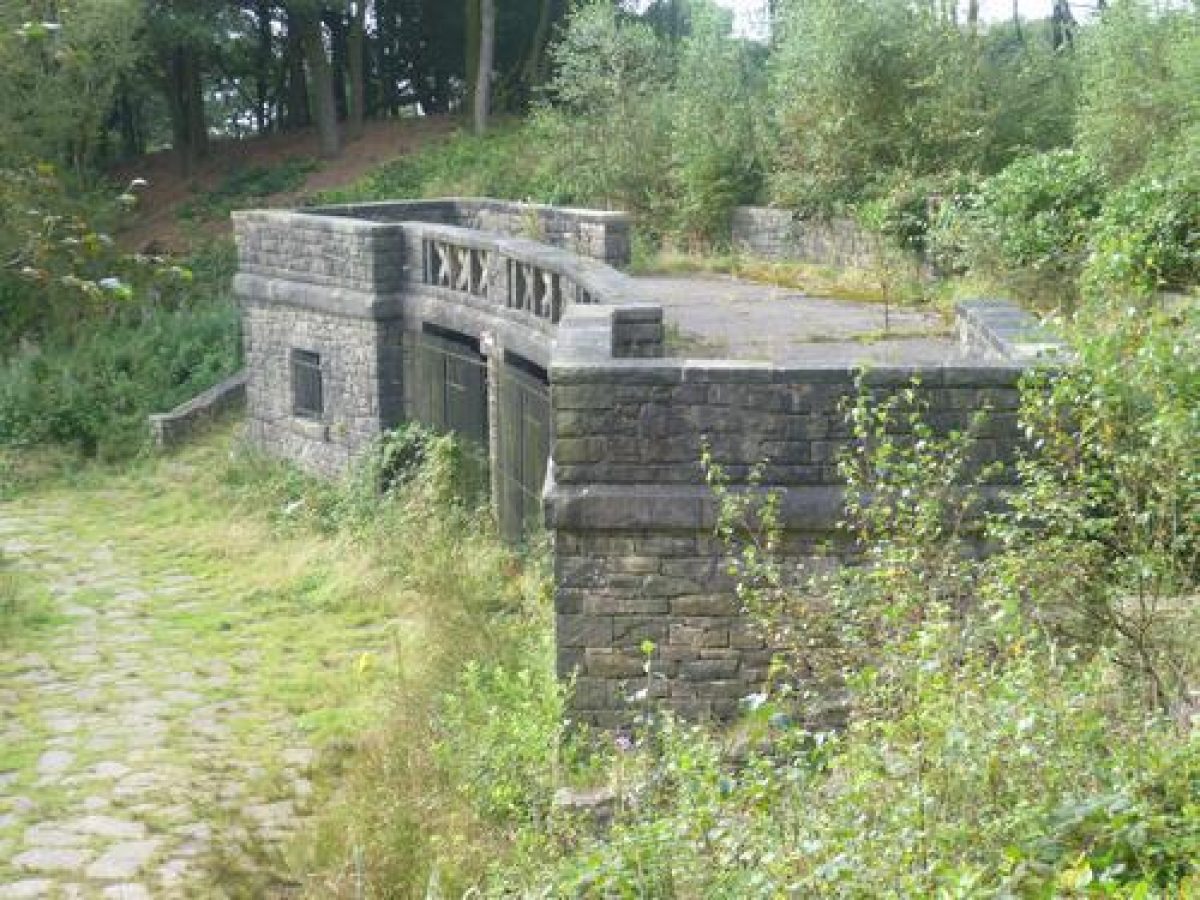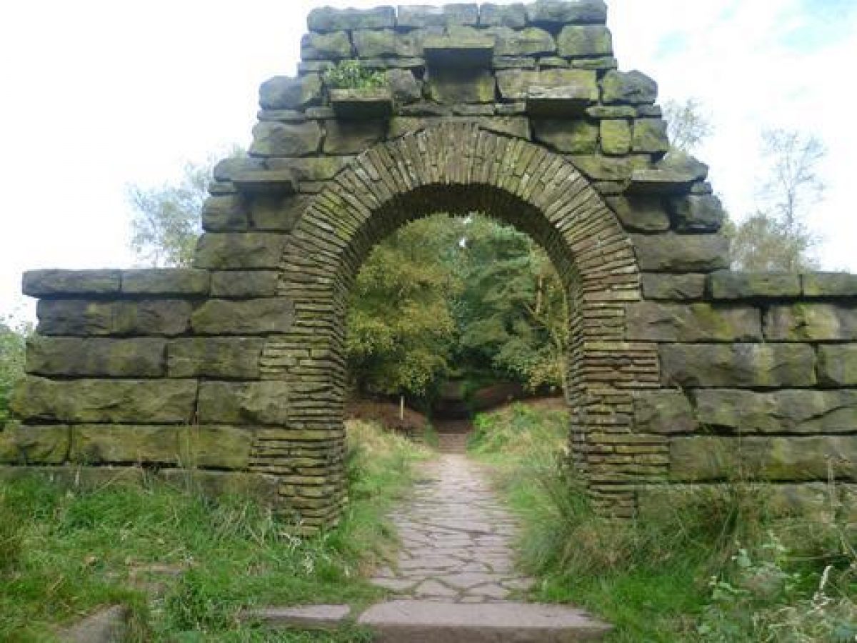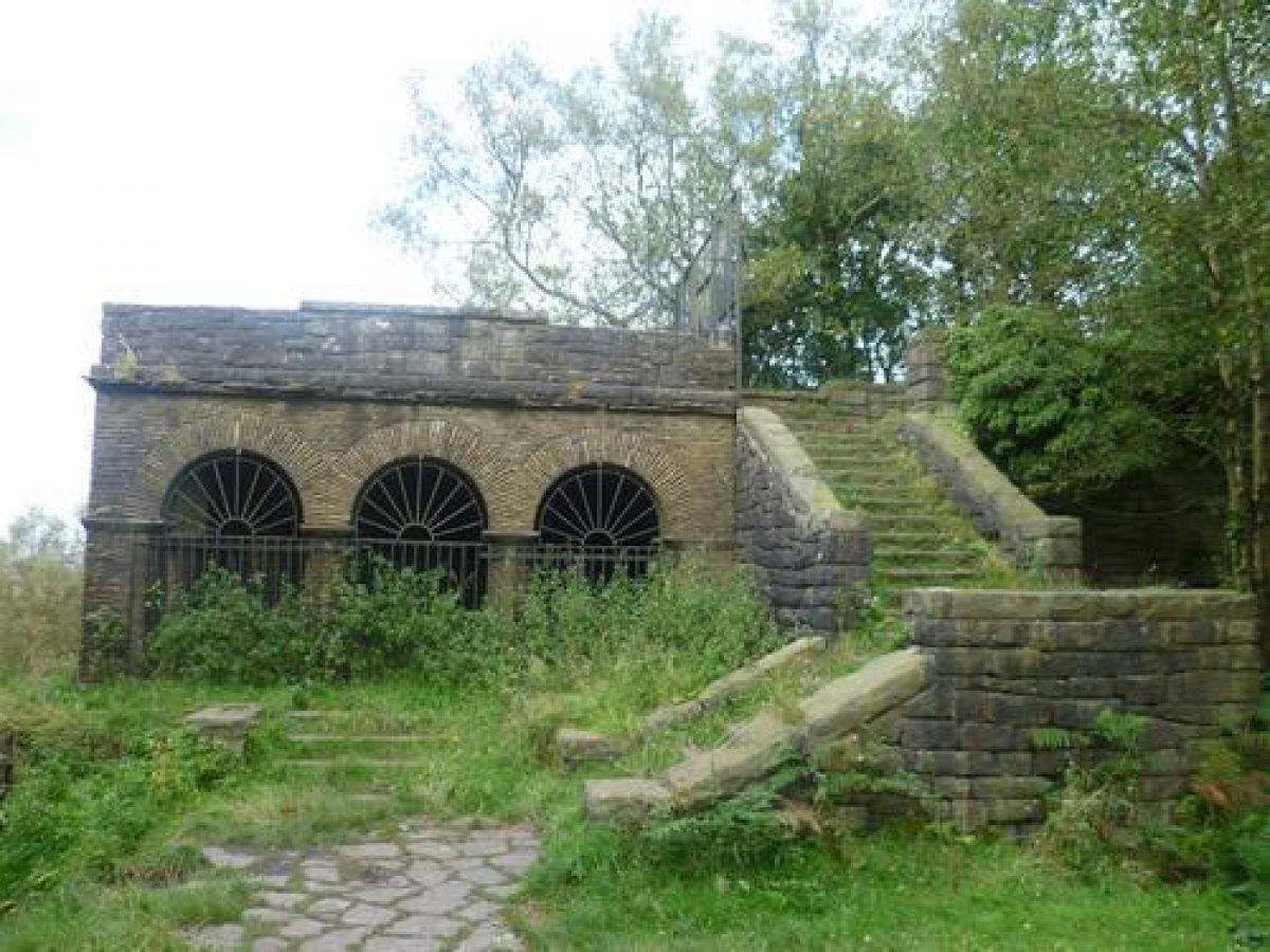 The area west of Roynton Lane consists of a steep wooded slope which is terraced, with paths running along the terraces. The area was formed from woodland called Hall Closes which is depicted on the 1st edition Ordnance Survey map surveyed in 1845-7. On the north side of the site an ornamental arched footbridge called Levers Bridge (Grade II), said to have been designed by Lever himself, crosses Roynton Lane and connects with steps leading upwards past two summer houses towards the swimming pool/boating lake to the east. A system of paths and stone steps leading down to the west connect with the path from the South Lodge entrance and to the terraced paths leading north/south across this part of the site. Some 350m south of Levers Bridge, on the lowest terrace, there is a summer house of similar design to those in the gardens. Steps lead up on either side of this and continue east up the slope serving to connect the terrace paths. A steep gorge called The Ravine is situated towards the southern end of the site. This feature was created in 1921 when natural streams across the site were diverted to fill the lake in the Japanese Garden and then to continue westward down the slope forming a series of cascades and waterfalls. Two bridges carry footpaths across the Ravine; the upper one which is situated about 80m west of the Japanese garden, is a simple stone arch, while the lower one has stone balustrades. Dramatic views of the waterfalls and adjacent rock formations are obtained from the bridges and from a crossing point formed by stepping stones midway between them.