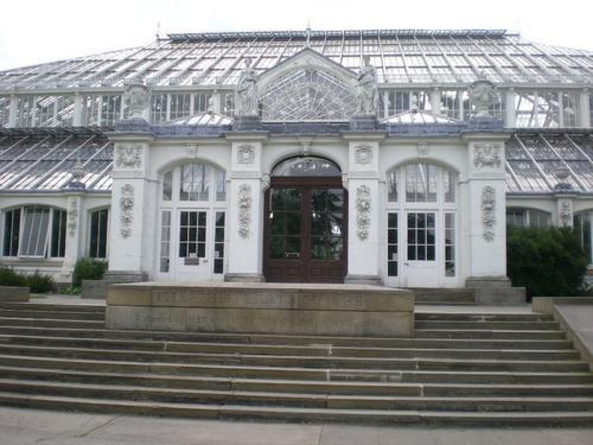 The perimeter path on the east side of the garden leads under the arch (listed grade II* ) designed as a ruin by Chamber c 1760, past the Marianne North Gallery (listed grade II), by James Ferguson c 1882, to the Palm House and Palm House Pond. The Pond, remodelled by Nesfield in 1847, is all that remains of the great lake made for George III which covered the area now occupied by the Palm House and beyond.