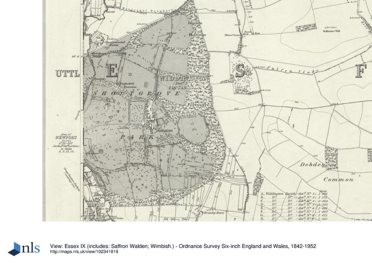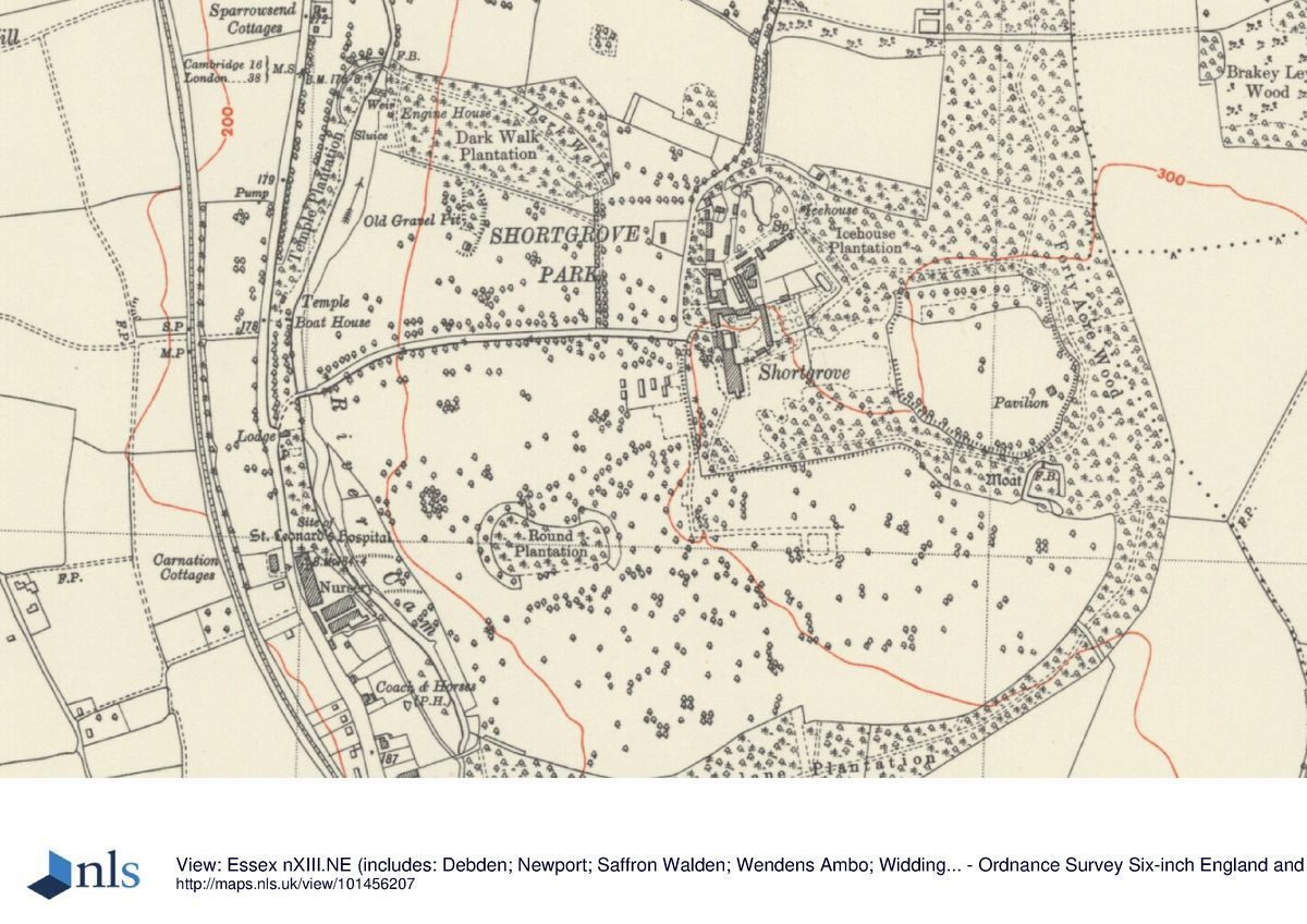 At the beginning of the C16 the manor of Shortgrove was acquired by the Finderne family. They sold it to the Elrington family who owned the Hall for three generations before it was purchased by Giles Dent, a London merchant, in c 1653. His son, also Giles,who inherited the estate in 1671, pulled down the old house in 1684 and built an elegant new mansion. Shortly before he died in 1712, the estate was sold to Henry O'Brien, Earl of Thomond, who added wings to the house. O'Brien also laid out gardens and canals, fed from the River Cam via an engine designed by Dr Desaguliers (Morant 1763(8). When Henry died in 1741, he left Shortgrove to his nephew Percy Wyndham, who took the name of O'Brien and the title of Earl of Thomond in 1756. Wyndham commissioned Matthew Brettingham to make further alterations to the house, and in 1753 called in Lancelot Brown (1716-83) to begin the laying out of new grounds around the house. Between then and the 1770s Brown also made substantial changes to the park. His work is recorded on an estate survey dated 1786. After Thomond died in 1774, Shortgrove was inherited by the Earl of Egremont, whose seat was at Petworth in Sussex (qv) and the Earl transferred the Shortgrove estate to his younger brother Percy Charles Wyndham. Between 1784 and 1788 footpaths and bridleways were closed, and a new road to Saffron Walden made along the western boundary of the park (ERO). Shortgrove was sold in 1802 to Joseph Smith whose son William inherited debts as well as the estate in 1822. The Hall was therefore let until 1837 when William Smith returned to take up residence. He lived at Shortgrove until the 1870s, during which time he and the Essex landscape gardener William Chater laid out expansive gardens to the east and north-east, including developing the area within the old walled gardens. The park however was left much as Brown had designed it. The result is noted in Chater's obituary published in the Gardeners' Chronicle in 1885, on the OS 1st edition 25" map of 1887, and in the sale catalogue which was produced in 1889 when William Smith died. Following several brief ownerships Shortgrove was purchased by Carl Meyer who, together with his wife Adele, lived on the estate in great style. By 1924 Adele was a widow and she left Shortgrove, selling the property to Captain Frederick Montague of Lynford Hall, Norfolk (qv). The estate came up for sale again in 1938 when it was purchased by the Butler family who retained most of the park but in 1963 sold the Hall and its immediate surroundings to a property speculator, Geoffrey Allen. Following a fire in 1966, the remains of the Hall were demolished and a small replacement erected, while the stables were converted into several private dwellings. In 1999 the mansion site, together with 8ha of land, were sold to the Scruby family who removed the 1980s house and began the erection of a new mansion. The site remains (2000) in divided private ownership.