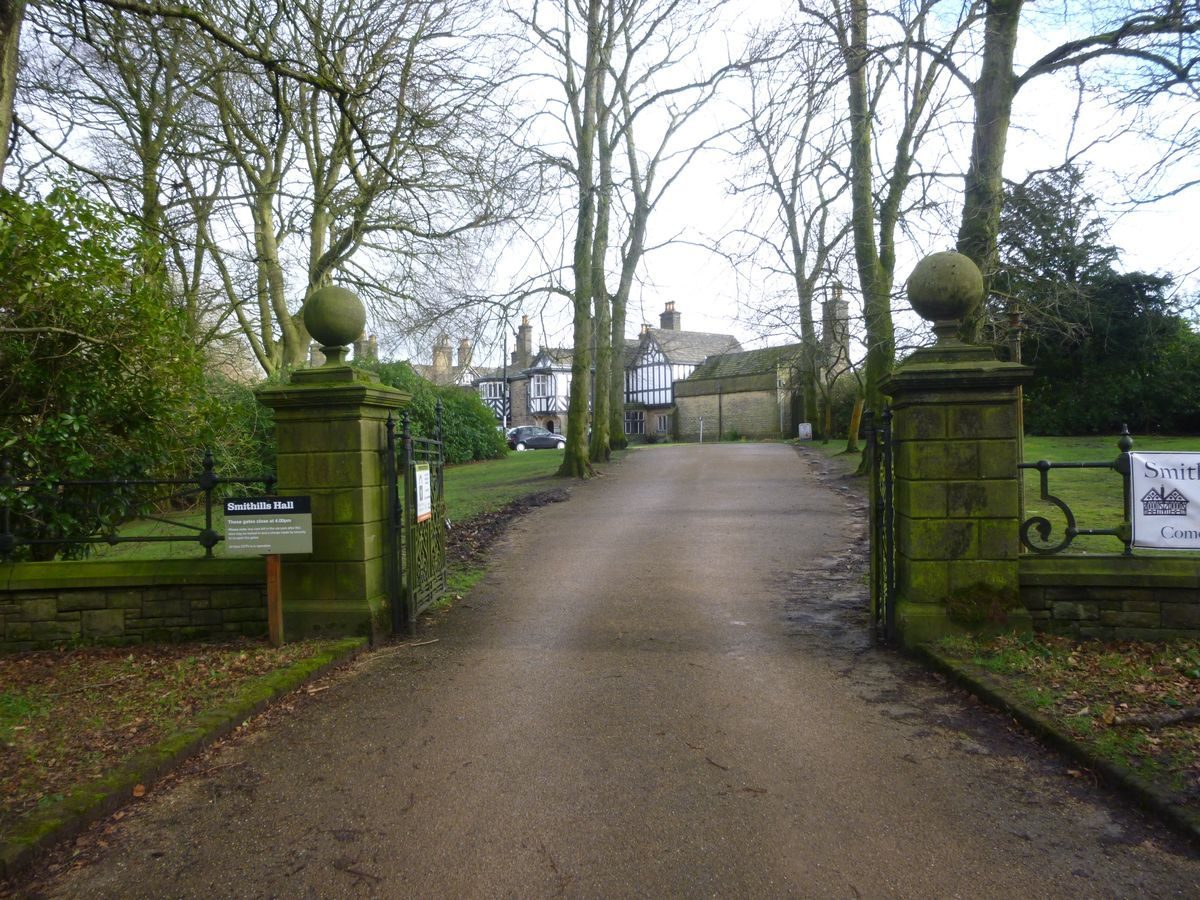 The principal entrance is from Smithills Dean Road where there is a lodge on the east side of the road from which a drive, flanked by C19 gate piers, runs east to the Hall. A lodge is shown in this position in 1850 (OS), though its present appearance, with mock timber framing, probably originated in the early C20. The drive divides, with one branch running to a stable block on the north side of the Hall and the other to a set of later C19 stone gate piers and iron gates from which it continues as a lime avenue to a courtyard on the north side of the Hall. The 1850 OS map shows one section of the drive running along the south front of the Hall, with another branch running north of the Hall.