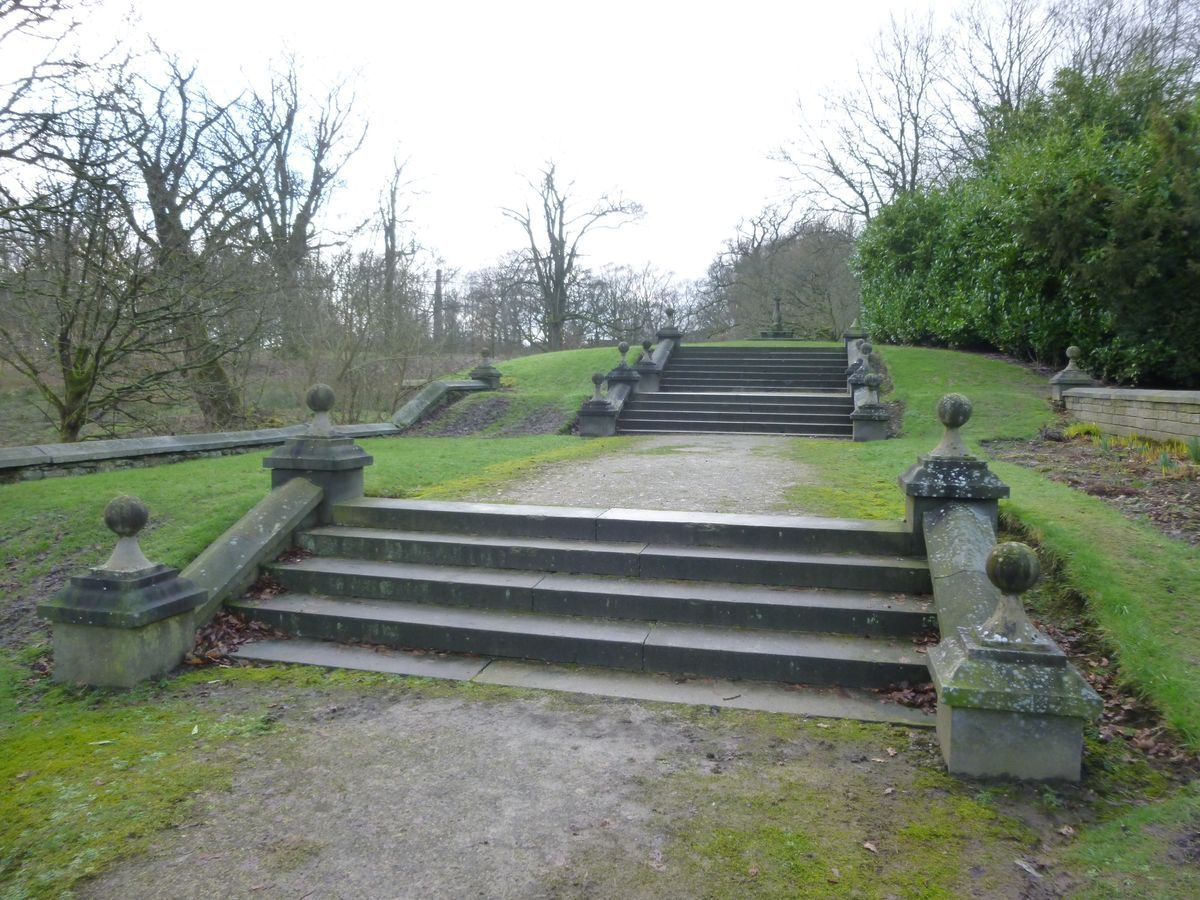 The gardens fall into two distinct parts with a formal terraced area around the Hall and wooded pleasure grounds to the north and east.