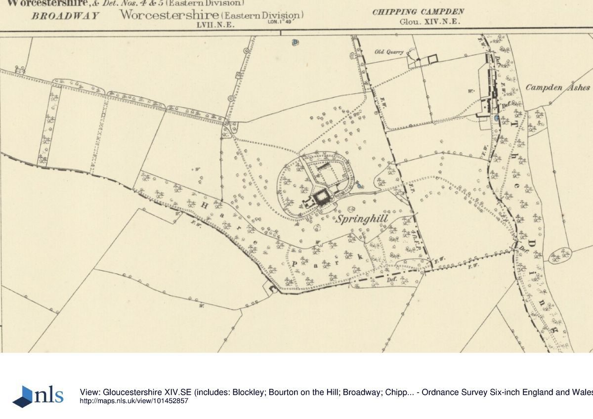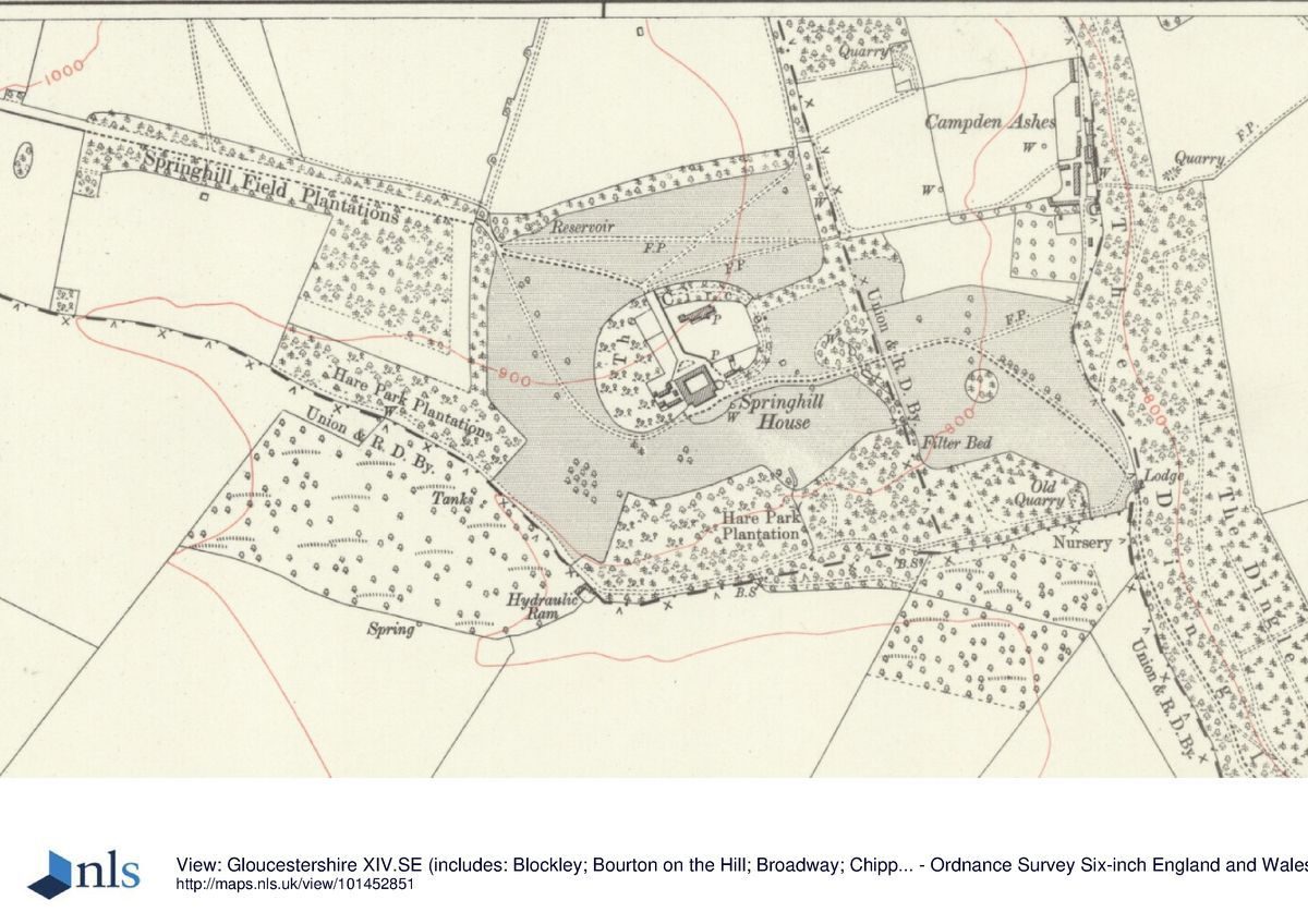 Spring Hill House (listed grade II) was built c 1763 for John Coventry-Bulkeley, sixth Earl of Coventry, by Lancelot Brown (Stroud 1975), although it has been suggested that the house may have been begun in 1757, by a different architect (listed buildings description). It is a large courtyard-plan house with a domestic range to the east and stable range to the west, linked across the north side by a coach house with cupola. Its south (garden) front is built of ashlar, with hipped slate roofs, and has two storeys. In 1830 General Lygon added wings and a porch to the south front. The north facade is of one-and-a-half storeys, built of rubble, with a stone slate roof.