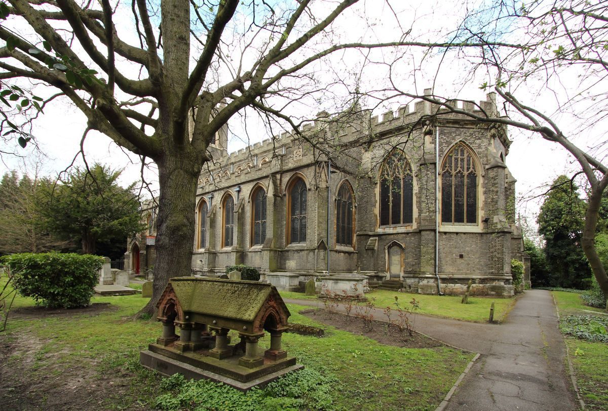 The small churchyard has a number of chest tombs and monuments among the grass and mature trees include yew and oak. The view to St Bartholomew's along Lawrie Park Avenue was made famous by the painter Camille Pissarro in 1871. Next to the church was Aberdeen House where the famous explorer Ernest Shackleton lived as a child.