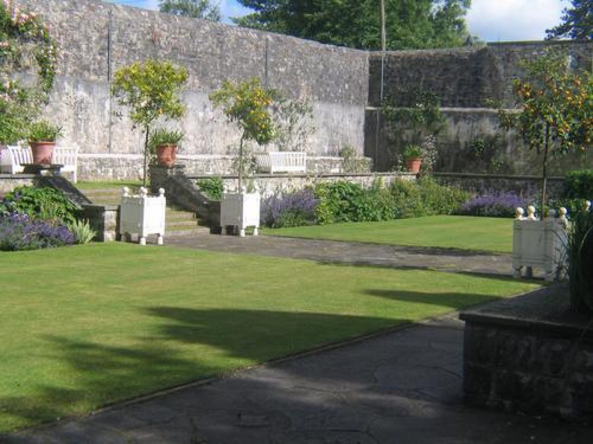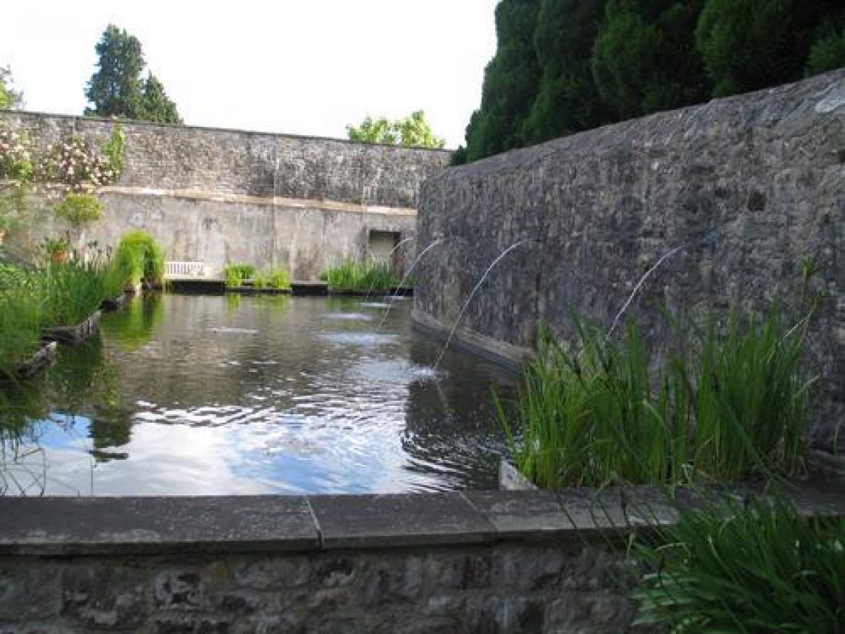 This high-walled compartment contains a raised pool into which water jets arc from the walls. There are grass steps, ornamental tubs containing orange trees, and roses trained up the walls. There is a small room at the north end of the rectangle which overlooks the garden.