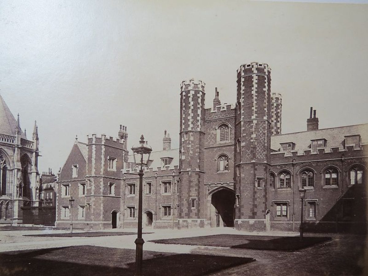 The college is approached at its east end, straight off St John's Street, through Front Gate beneath the Gate Tower (1511-20), giving access to the east side of First Court (1511-20, listed grade I). The court contains two panels of lawn divided by the axial path running west from the Gate Tower which links First, Second and Third Courts. The foundations of the medieval chapel are visible in the north panel, to the north of which stands the C19 chapel (Sir Gilbert Scott 1863-9, listed grade I) built in C13 Gothic style, dominating the court and its surroundings with its massive tower.