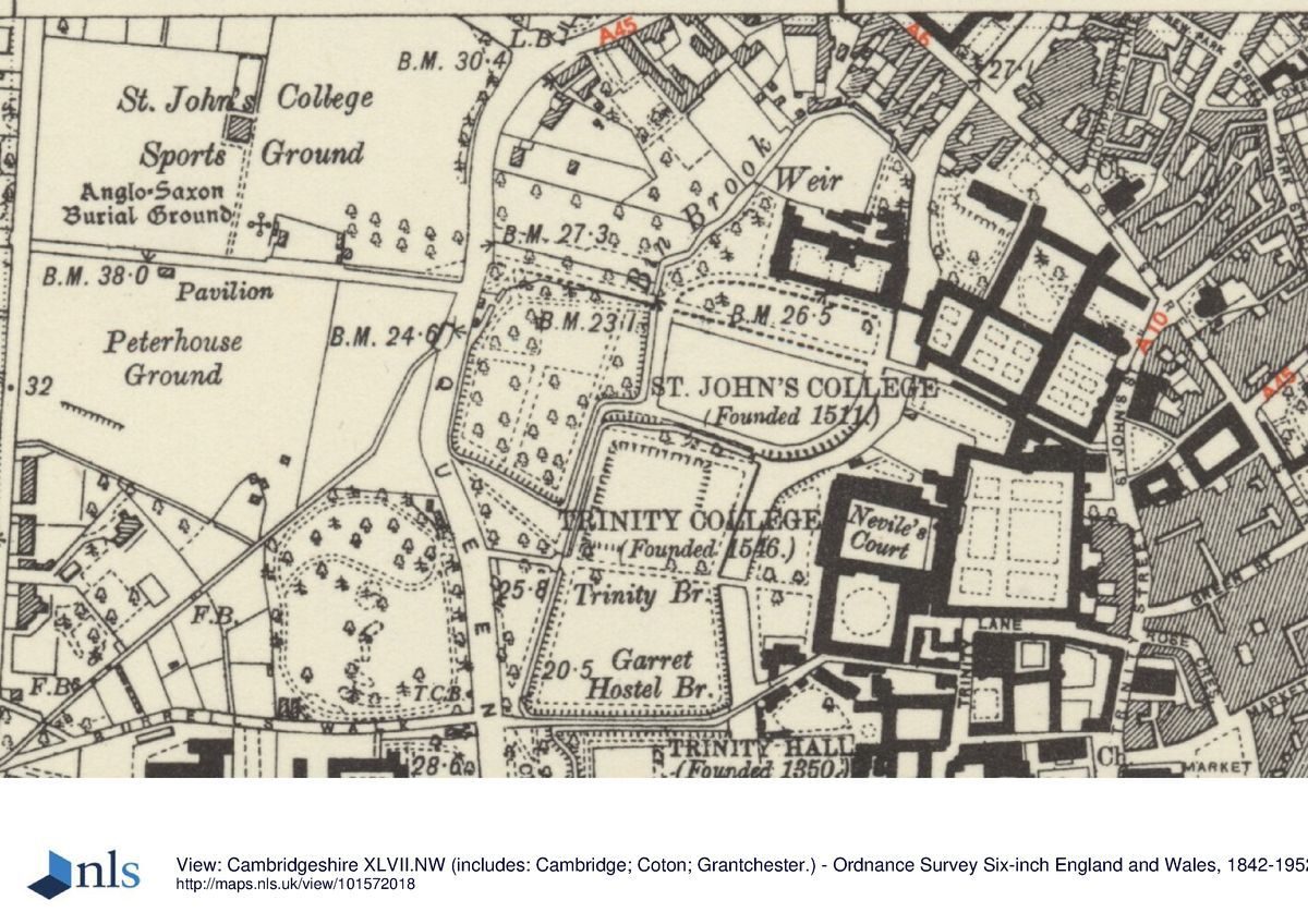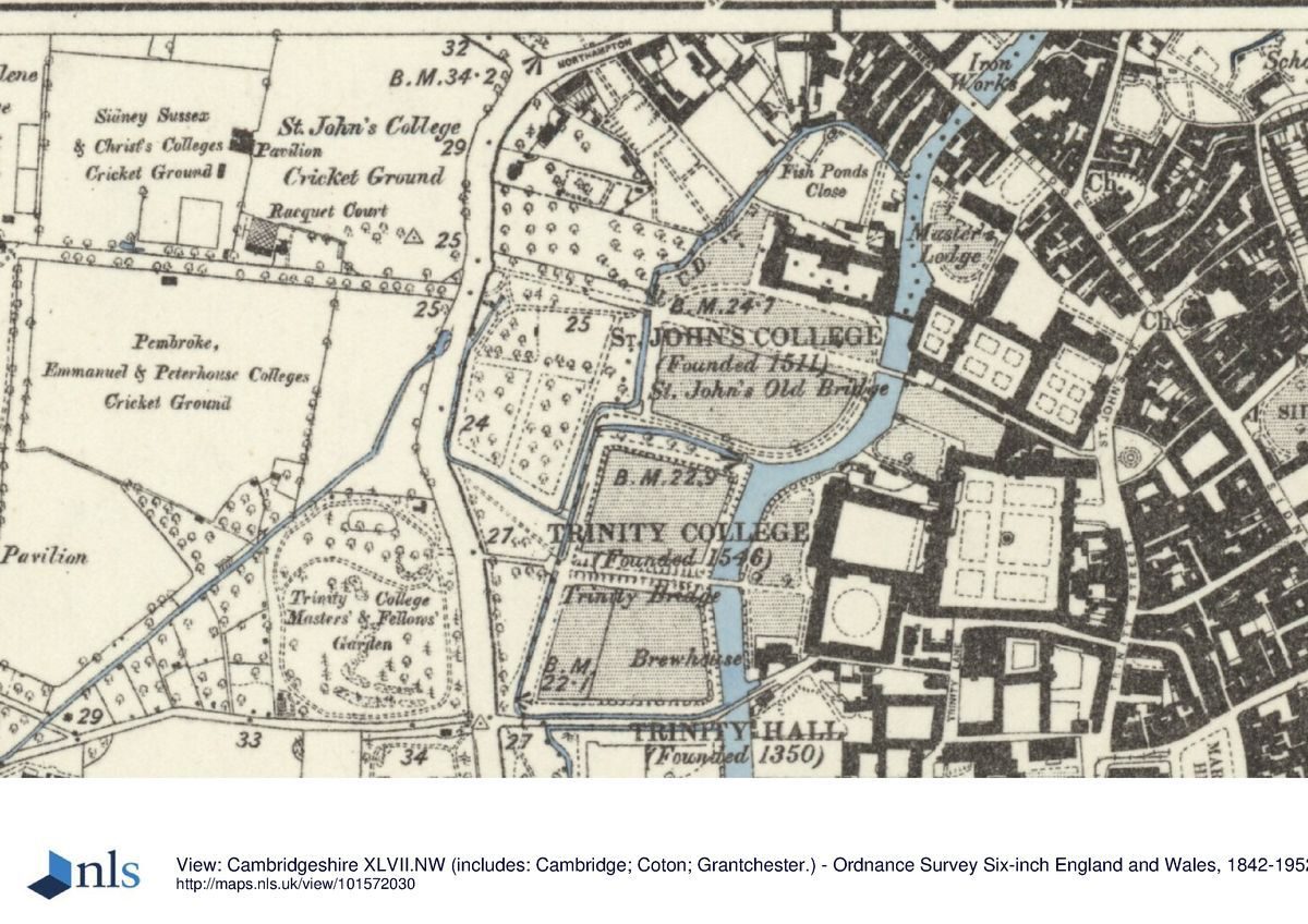 Flat.David Loggan's view of St. John's College, around 1690, shows the three enclosed courts to the east of the river all laid out on an axis, with grass lawns surrounded and crossed by paths. To the west of the river the College owned extensive land which at that time consisted of a High Walk bordered by trees extending over the Bin Brook, (elegant cast-iron bridge created about 1822) to the gateway at Queens' Road.