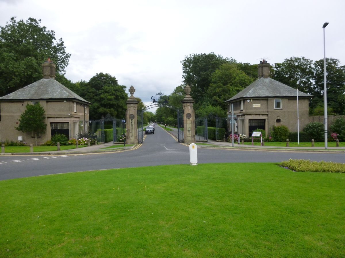 The principal entrance to the park is situated towards the north-west corner of the site at the head of Mere Road. There is a circus at this point and the main entrance faces this and consists of splayed walls and a central pair of stone gate piers with urn finials and plaques commemorating the opening of the park, cast-iron gates with an ornamental overthrow which has the words 'Stanley Park', and flanking secondary gates with Blackpool's coat of arms. On each side there is a lodge, called North and South Lodge respectively, of restrained classical style with hipped roofs and central chimneys. There is a separate entrance to a cricket pitch, which is walled and has gates, c 40m south of the main entrance, and there is a C20 entrance to a sports centre c 300m south of the cricket ground. Other entrances consist of simple pairs of gate piers in accordance with Mawson's stipulation that secondary entrances should be treated 'with the severest simplicity' (Mawson 1927). The principal entrance links with a broad avenue which leads east across the site to a car park and service area on the north-west side of a cafe at the centre of the site.