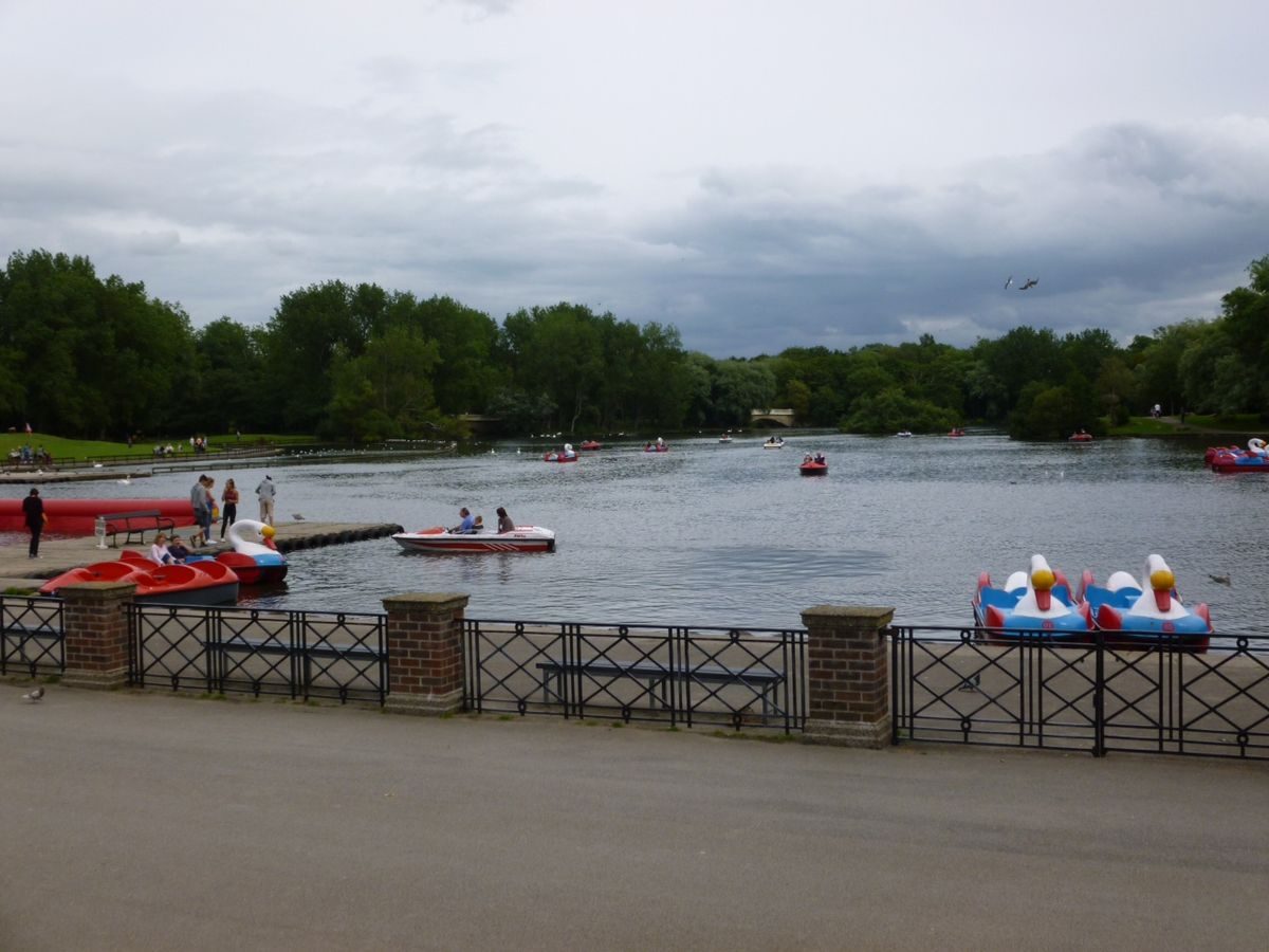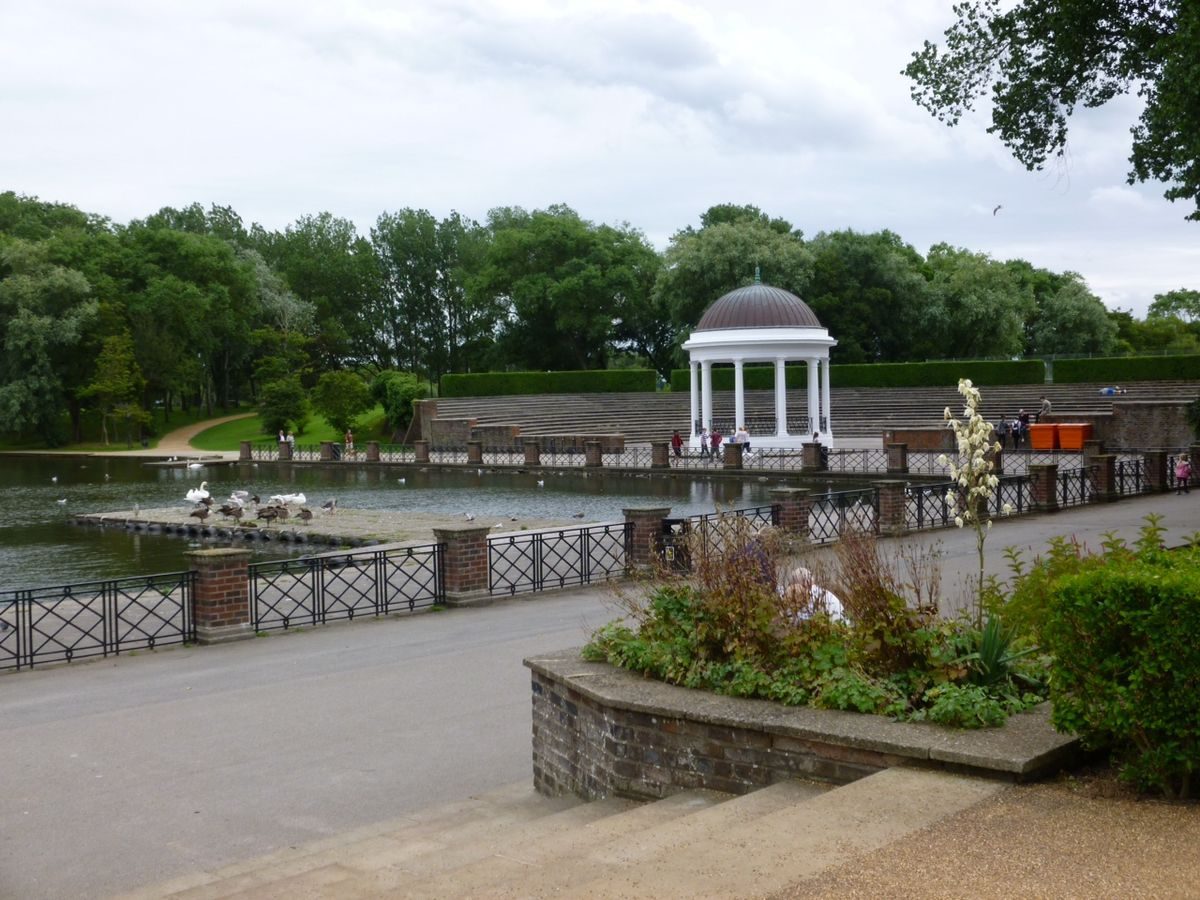 On the east side of the Italian Gardens paths lead to a terrace overlooking a large lake. The western shore has a walkway and iron railings. On the south shore, c 100m south-east of the Italian Gardens, there is a semicircular amphitheatre with seating facing a lakeside bandstand in the form of a circular classical temple. Mawson had intended the bandstand to be on a promontory to the east so that it would terminate the vista from the Italian Gardens across the lake. On the north shore, c 150m north-east of the Italian Gardens, there is a range of boathouses. The lake is approximately in the shape of a reversed L, with the long arm running north/south along the north-eastern edge of the park. The shore lines become irregular, with rockwork in places to the east of the formal bandstand and boathouse area and there are sinuous walks along the edges through tree belts. The lake narrows c 400m north of the Italian Gardens, at the angle of the L, and at this point there is an island connected to the shores on each side by stone balustraded footbridges. The outline of the northern part of the lake is slightly at variance with Mawson's 1922 plan which does not show the footbridges. An area immediately south of the south-east corner of the lake is occupied by an enclosed model village.